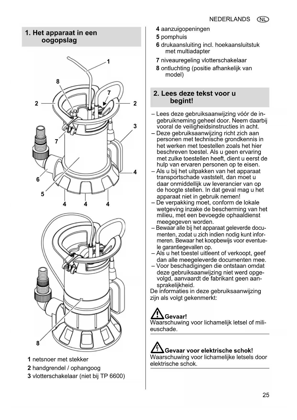 oogopslag 1 netsnoer met stekker 2 handgrendel / ophangoog 3 vlotterschakelaar (niet bij TP 6600)