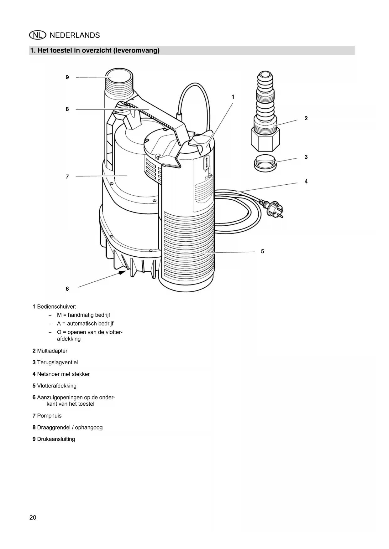 - 1 Bedienschuiver: M = handmatig bedrijf A = automatisch bedrijf O = openen van de vlotter- afdekking 2 Multiadapter 3 Terugslagventiel 4 Netsnoer met stekker 5 Vlotterafdekking 6 Aanzuigopeningen op de onder- kant van het toestel 7 Pomphuis 8 Draaggrendel / ophangoog 9 Drukaansluiting XP0024H4.fm Origineel gebruikaanwijzing NEDERLANDS21 NEDERLANDS 1. Het toestel in overzicht (leveromvang) p. 202