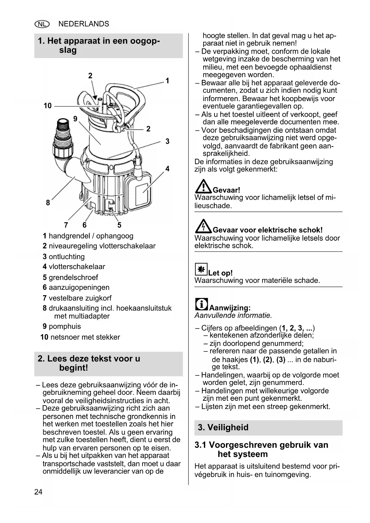 I_0009nl4A.fm 5.7.10 Origineel gebruikaanwijzing25 NEDERLANDS Toegelaten pompvloeistof: zuiver of afvalwa- ter – Het aandeel aan zwevende deeltjes in het afvalwater mag niet meer dan 5% bedra- gen. – Het aandeel aan vaste stoffen in het afval- water mag de bij de technische gegevens aangegeven korrelgrootte niet overschrij- ven. Elke andere vorm van gebruik geldt als niet doelmatig en is niet toegelaten. Typische toepassingsgebieden – Uitpompen van tanks, waterbekkens, zwembaden, zinkputten of overstroomde ruimten. – Besproeien van tuinen en gazons. Verboden gebruik Het apparaat is niet voor – het pompen van vloeistoffen met een tem- peratuur > 35 °C. – drinkwatertoevoer of het pmpen van le- vensmiddelen. – het pompen van zout water. – het pompen van explosieve, ontvlambare, agressieve of gevaarlijke stoffen en faeca- liën. – commercieel of industrieel gebruik. – permanente circulatie (vijver). Personen (met inbegrip van kinderen en jon- geren) mogen het apparaat niet gebruiken als ze – over beperkte lichamelijke en/of mentale vaardigheden beschikken, – onvoldoende waarnemingsvermogen heb- ben, – onvoldoende ervaring en/of kennis met resp. in de omgang met het apparaat heb- ben of – de handleiding niet gelezen en begrepen hebben. Voor schade door foutief gebruik aanvaardt de fabrikant geen verantwoordelijkheid. Door onreglementair gebruik, veranderingen aan het toestel of door gebruik van onderde- len die niet door de fabrikant gekeurd en vrij- gegeven zijn, kunnen niet te voorziene be- schadigingen ontstaan!