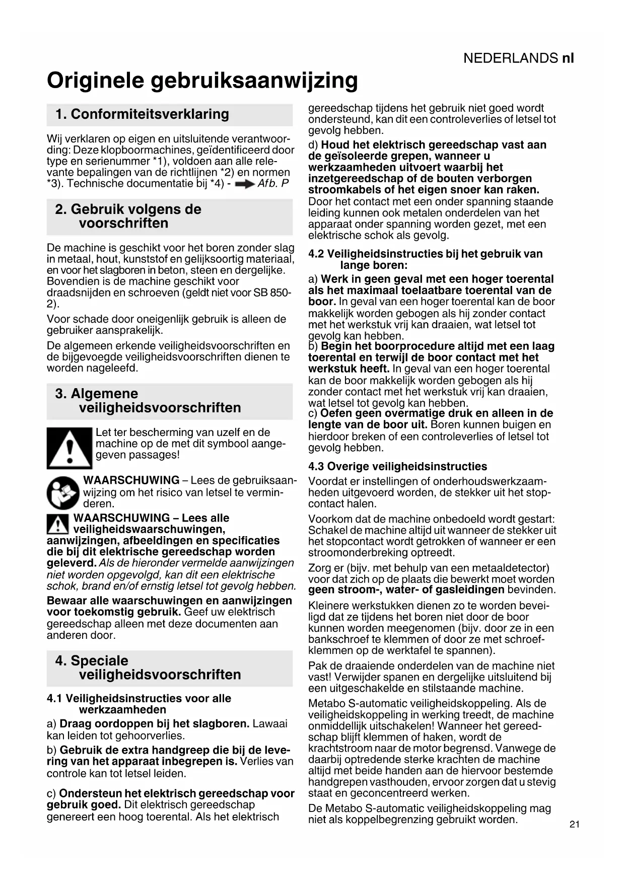 Voordat er instellingen of onderhoudswerkzaam- heden uitgevoerd worden, de stekker uit het stop- contact halen. Voorkom dat de machine onbedoeld wordt gestart: Schakel de machine altijd uit wanneer de stekker uit het stopcontact wordt getrokken of wanneer er een stroomonderbreking optreedt. Zorg er (bijv. met behulp van een metaaldetector) voor dat zich op de plaats die bewerkt moet worden geen stroom-, water- of gasleidingen bevinden. Kleinere werkstukken dienen zo te worden bevei- ligd dat ze tijdens het boren niet door de boor kunnen worden meegenomen (bijv. door ze in een bankschroef te klemmen of door ze met schroef- klemmen op de werktafel te spannen). Pak de draaiende onderdelen van de machine niet vast! Verwijder spanen en dergelijke uitsluitend bij een uitgeschakelde en stilstaande machine. Metabo S-automatic veiligheidskoppeling. Als de veiligheidskoppeling in werking treedt, de machine onmiddellijk uitschakelen! Wanneer het gereed- schap blijft klemmen of haken, wordt de krachtstroom naar de motor begrensd. Vanwege de daarbij optredende sterke krachten de machine altijd met beide handen aan de hiervoor bestemde handgrepen vasthouden, ervoor zorgen dat u stevig staat en geconcentreerd werken. De Metabo S-automatic veiligheidskoppeling mag niet als koppelbegrenzing gebruikt worden.