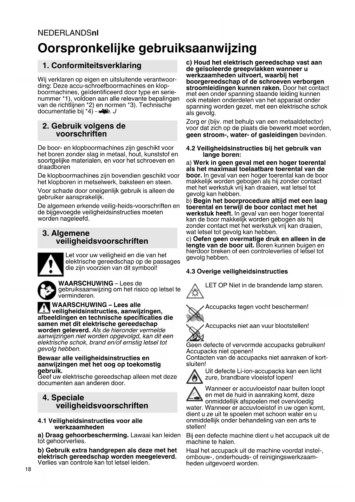 Wij verklaren op eigen en uitsluitende verantwoor- ding: Deze accu-schroefboormachines en klop- boormachines, geïdentificeerd door type en serie- nummer *1), voldoen aan alle relevante bepalingen van de richtlijnen *2) en normen *3). Technische documentatie bij *4) - Afb. J De boor- en klopboormachines zijn geschikt voor het boren zonder slag in metaal, hout, kunststof en soortgelijke materialen, en voor het schroeven en draadboren De klopboormachines zijn bovendien geschikt voor het klopboren in metselwerk, baksteen en steen. Voor schade door oneigenlijk gebruik is alleen de gebruiker aansprakelijk. De algemeen erkende veilig-heids-voorschriften en de bijgevoegde veiligheidsinstructies moeten worden nageleefd. Let voor uw veiligheid en die van het elektrische gereedschap op de passages die zijn voorzien van dit symbool! WAARSCHUWING – Lees de gebruiksaanwijzing om het risico op letsel te verminderen. WAARSCHUWING – Lees alle veiligheidsinstructies, aanwijzingen, afbeeldingen en technische specificaties die samen met dit elektrische gereedschap worden geleverd. Als de hieronder vermelde aanwijzingen niet worden opgevolgd, kan dit een elektrische schok, brand en/of ernstig letsel tot gevolg hebben. Bewaar alle veiligheidsinstructies en aanwijzingen met het oog op toekomstig gebruik. Geef uw elektrische gereedschap alleen met deze documenten aan anderen door.