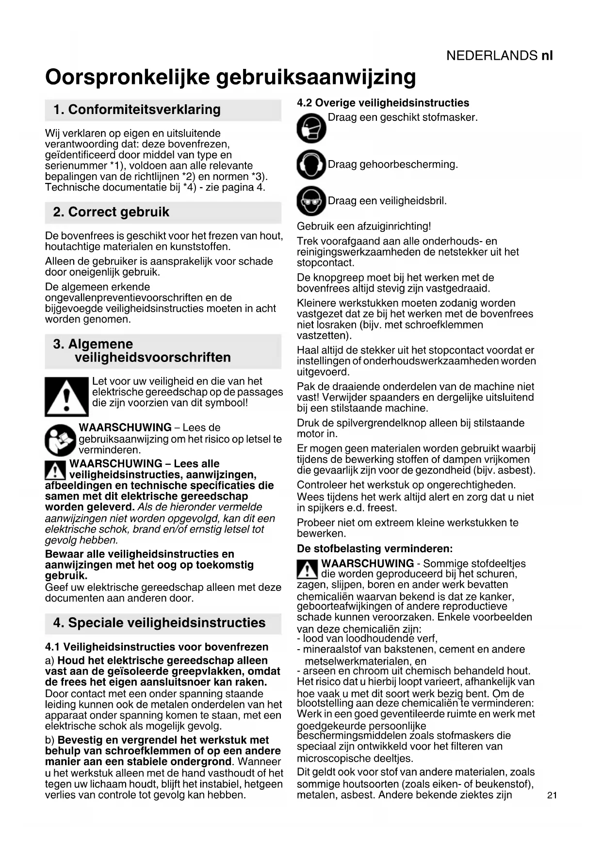 Oorspronkelijke gebruiksaanwijzing Wij verklaren op eigen en uitsluitende verantwoording dat: deze bovenfrezen, geïdentificeerd door middel van type en serienummer *1), voldoen aan alle relevante bepalingen van de richtlijnen *2) en normen *3). Technische documentatie bij *4) - zie pagina 4. De bovenfrees is geschikt voor het frezen van hout, houtachtige materialen en kunststoffen. Alleen de gebruiker is aansprakelijk voor schade door oneigenlijk gebruik. De algemeen erkende ongevallenpreventievoorschriften en de bijgevoegde veiligheidsinstructies moeten in acht worden genomen. Let voor uw veiligheid en die van het elektrische gereedschap op de passages die zijn voorzien van dit symbool! WAARSCHUWING – Lees de gebruiksaanwijzing om het risico op letsel te verminderen. WAARSCHUWING – Lees alle veiligheidsinstructies, aanwijzingen, afbeeldingen en technische specificaties die samen met dit elektrische gereedschap worden geleverd. Als de hieronder vermelde aanwijzingen niet worden opgevolgd, kan dit een elektrische schok, brand en/of ernstig letsel tot gevolg hebben. Bewaar alle veiligheidsinstructies en aanwijzingen met het oog op toekomstig gebruik. Geef uw elektrische gereedschap alleen met deze documenten aan anderen door.