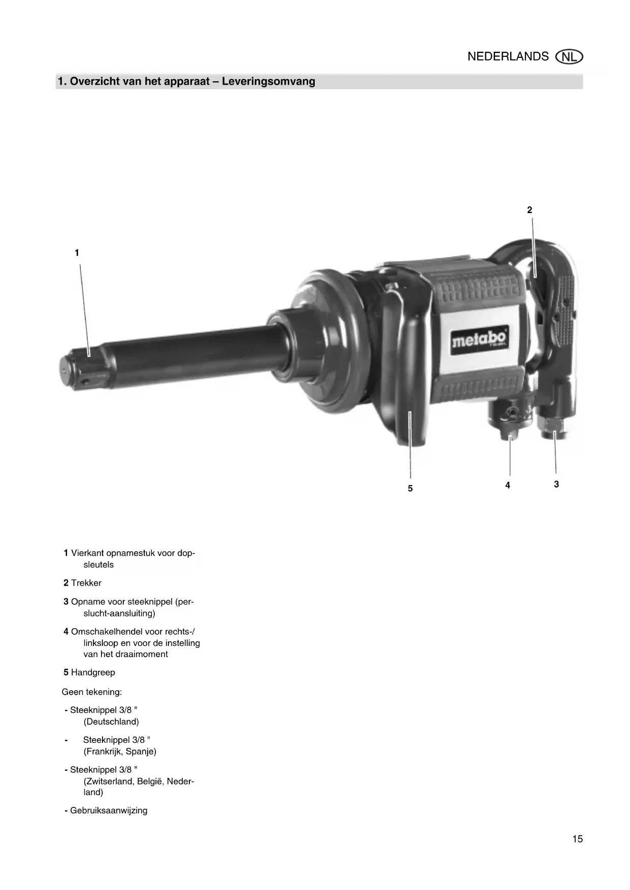 Dit gereedschap mag uitsluitend door een persluchtcompressor worden aangedreten. De maximaal toegelaten werkdruk vermeld in de technische gegevens mag Niet worden overschreden. Dit gereedschap mag Niet met explosieve, brandbare of gezondheids-bedreigende gassen worden geexploiteerd.