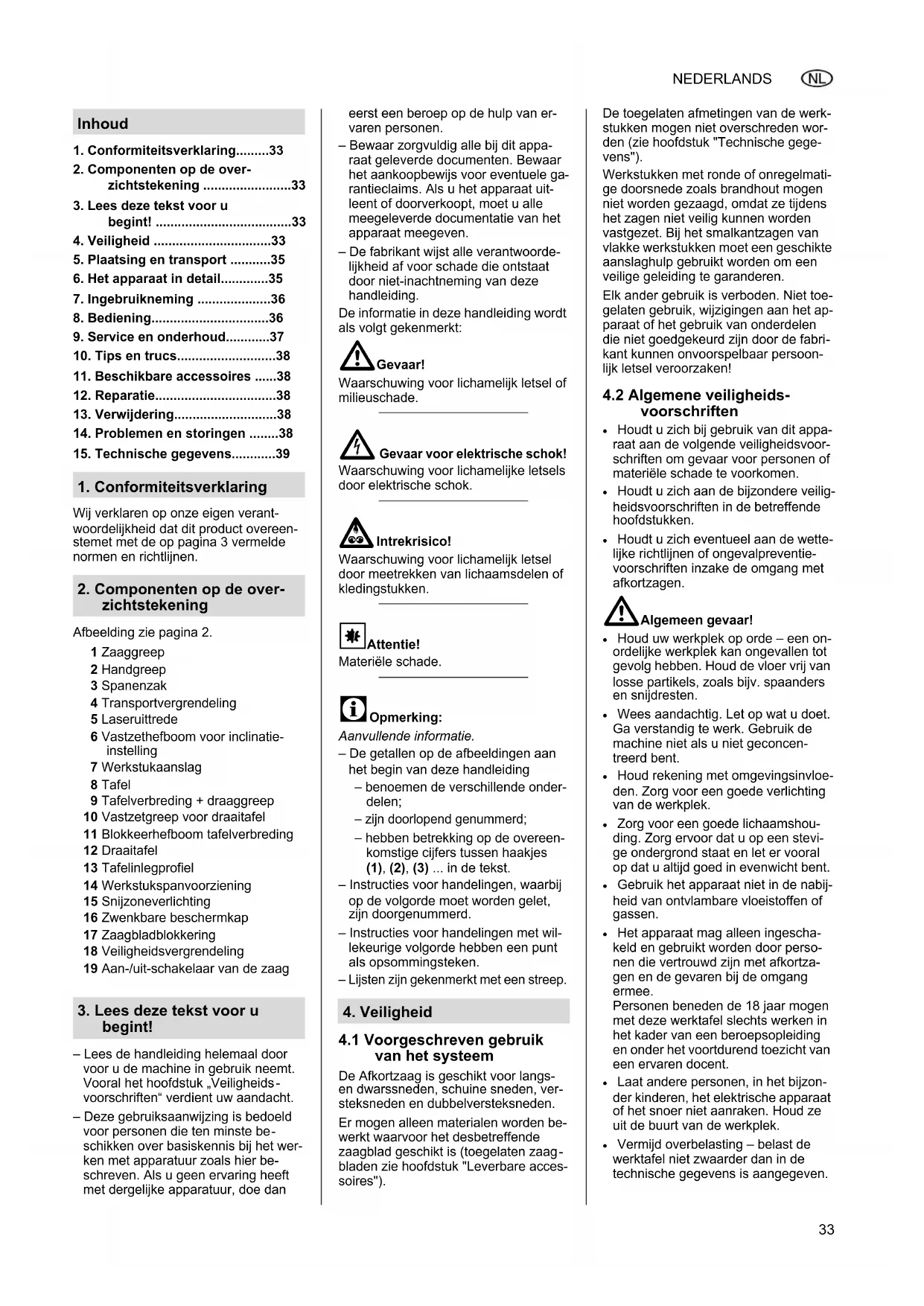 Wij verklaren op onze eigen verant- woordelijkheid dat dit product overeen- stemet met de op pagina 3 vermelde normen en richtlijnen. Afbeelding zie pagina 2. – Lees de handleiding helemaal door voor u de machine in gebruik neemt. Vooral het hoofdstuk „Veiligheids