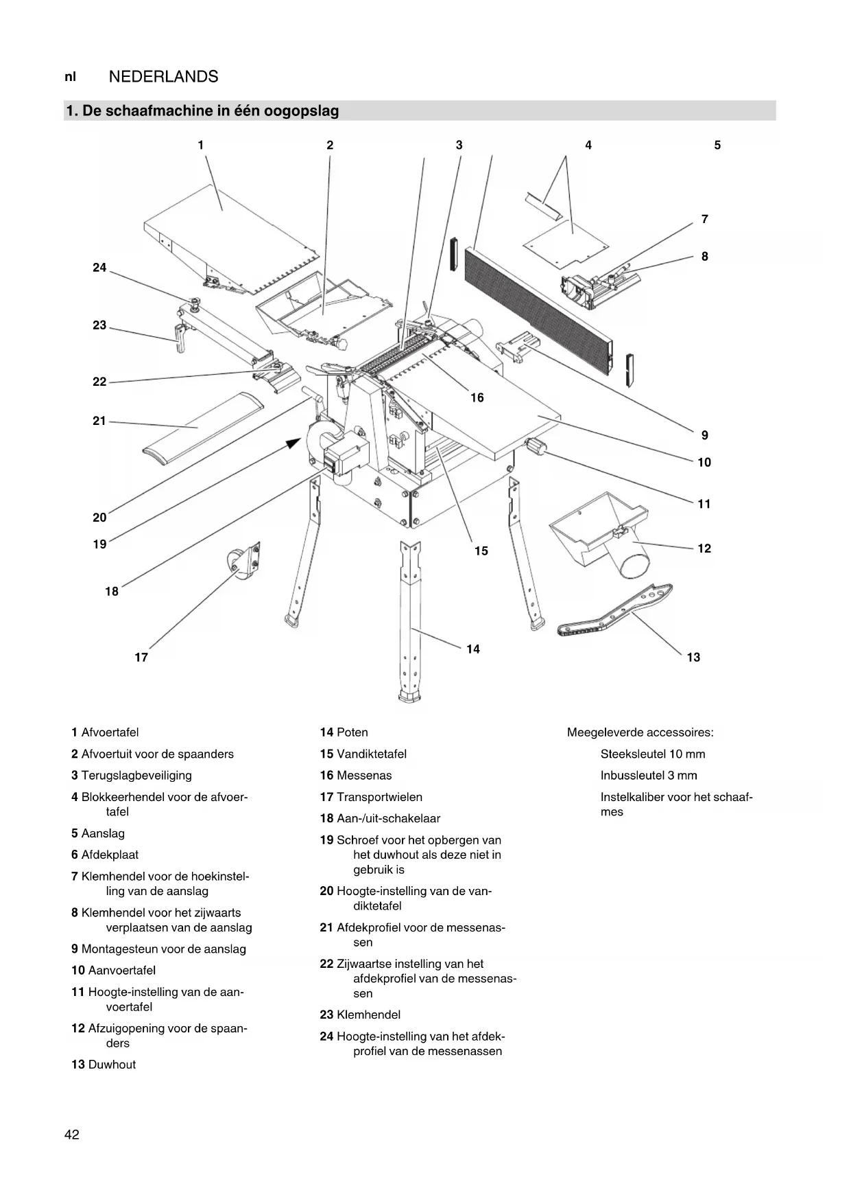 1 Afvoertafel 2 Afvoertuit voor de spaanders 3 Terugslagbeveiliging 4 Blokkeerhendel voor de afvoer- tafel 5 Aanslag 6 Afdekplaat 7 Klemhendel voor de hoekinstel- ling van de aanslag 8 Klemhendel voor het zijwaarts verplaatsen van de aanslag 9 Montagesteun voor de aanslag 10 Aanvoertafel 11 Hoogte-instelling van de aan- voertafel 12 Afzuigopening voor de spaan- ders 13 Duwhout 14 Poten 15 Vandiktetafel 16 Messenas 17 Transportwielen 18 Aan-/uit-schakelaar 19 Schroef voor het opbergen van het duwhout als deze niet in gebruik is 20 Hoogte-instelling van de van- diktetafel 21 Afdekprofiel voor de messenas- sen 22 Zijwaartse instelling van het afdekprofiel van de messenas- sen 23 Klemhendel 24 Hoogte-instelling van het afdek- profiel van de messenassen Meegeleverde accessoires: Steeksleutel 10 mm Inbussleutel 3 mm Instelkaliber voor het schaaf- mes HC260_XW0014D5_nl.fm Originele gebruiksaanwijzing NEDERLANDS43 NEDERLANDS
