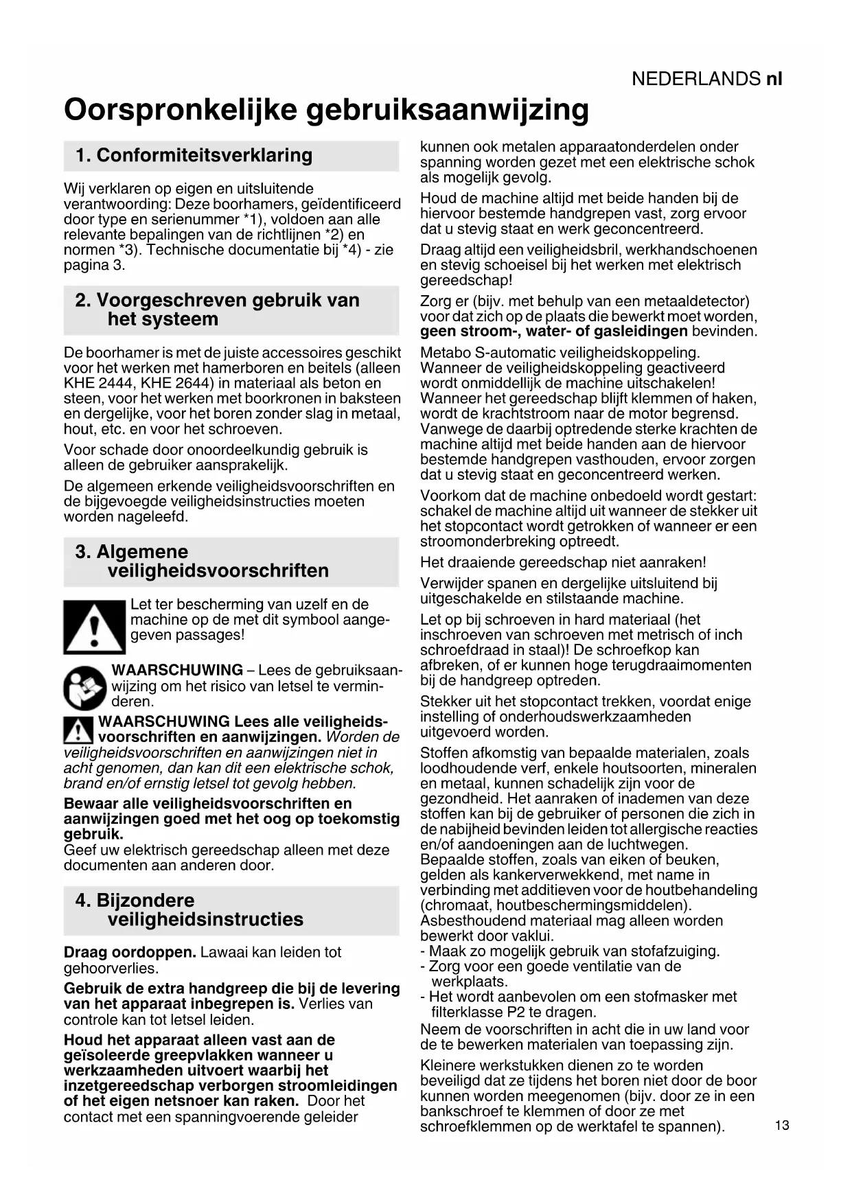 Oorspronkelijke gebruiksaanwijzing Wij verklaren op eigen en uitsluitende verantwoording: Deze boorhamers, geïdentificeerd door type en serienummer *1), voldoen aan alle relevante bepalingen van de richtlijnen *2) en normen *3). Technische documentatie bij *4) - zie pagina 3. De boorhamer is met de juiste accessoires geschikt voor het werken met hamerboren en beitels (alleen KHE 2444, KHE 2644) in materiaal als beton en steen, voor het werken met boorkronen in baksteen en dergelijke, voor het boren zonder slag in metaal, hout, etc. en voor het schroeven. Voor schade door onoordeelkundig gebruik is alleen de gebruiker aansprakelijk. De algemeen erkende veiligheidsvoorschriften en de bijgevoegde veiligheidsinstructies moeten worden nageleefd. Let ter bescherming van uzelf en de machine op de met dit symbool aange- geven passages! WAARSCHUWING – Lees de gebruiksaan- wijzing om het risico van letsel te vermin- deren. WAARSCHUWING Lees alle veiligheids- voorschriften en aanwijzingen. Worden de veiligheidsvoorschriften en aanwijzingen niet in acht genomen, dan kan dit een elektrische schok, brand en/of ernstig letsel tot gevolg hebben. Bewaar alle veiligheidsvoorschriften en aanwijzingen goed met het oog op toekomstig gebruik. Geef uw elektrisch gereedschap alleen met deze documenten aan anderen door. Draag oordoppen. Lawaai kan leiden tot gehoorverlies. Gebruik de extra handgreep die bij de levering van het apparaat inbegrepen is. Verlies van controle kan tot letsel leiden. Houd het apparaat alleen vast aan de geïsoleerde greepvlakken wanneer u werkzaamheden uitvoert waarbij het inzetgereedschap verborgen stroomleidingen of het eigen netsnoer kan raken. Door het contact met een spanningvoerende geleider kunnen ook metalen apparaatonderdelen onder spanning worden gezet met een elektrische schok als mogelijk gevolg. Houd de machine altijd met beide handen bij de hiervoor bestemde handgrepen vast, zorg ervoor dat u stevig staat en werk geconcentreerd. Draag altijd een veiligheidsbril, werkhandschoenen en stevig schoeisel bij het werken met elektrisch gereedschap! Zorg er (bijv. met behulp van een metaaldetector) voor dat zich op de plaats die bewerkt moet worden, geen stroom-, water- of gasleidingen bevinden. Metabo S-automatic veiligheidskoppeling. Wanneer de veiligheidskoppeling geactiveerd wordt onmiddellijk de machine uitschakelen! Wanneer het gereedschap blijft klemmen of haken, wordt de krachtstroom naar de motor begrensd. Vanwege de daarbij optredende sterke krachten de machine altijd met beide handen aan de hiervoor bestemde handgrepen vasthouden, ervoor zorgen dat u stevig staat en geconcentreerd werken. Voorkom dat de machine onbedoeld wordt gestart: schakel de machine altijd uit wanneer de stekker uit het stopcontact wordt getrokken of wanneer er een stroomonderbreking optreedt. Het draaiende gereedschap niet aanraken! Verwijder spanen en dergelijke uitsluitend bij uitgeschakelde en stilstaande machine. Let op bij schroeven in hard materiaal (het inschroeven van schroeven met metrisch of inch schroefdraad in staal)! De schroefkop kan afbreken, of er kunnen hoge terugdraaimomenten bij de handgreep optreden. Stekker uit het stopcontact trekken, voordat enige instelling of onderhoudswerkzaamheden uitgevoerd worden. Stoffen afkomstig van bepaalde materialen, zoals loodhoudende verf, enkele houtsoorten, mineralen en metaal, kunnen schadelijk zijn voor de gezondheid. Het aanraken of inademen van deze stoffen kan bij de gebruiker of personen die zich in de nabijheid bevinden leiden tot allergische reacties en/of aandoeningen aan de luchtwegen. Bepaalde stoffen, zoals van eiken of beuken, gelden als kankerverwekkend, met name in verbinding met additieven voor de houtbehandeling (chromaat, houtbeschermingsmiddelen). Asbesthoudend materiaal mag alleen worden bewerkt door vaklui. - Maak zo mogelijk gebruik van stofafzuiging. - Zorg voor een goede ventilatie van de werkplaats. - Het wordt aanbevolen om een stofmasker met filterklasse P2 te dragen. Neem de voorschriften in acht die in uw land voor de te bewerken materialen van toepassing zijn. Kleinere werkstukken dienen zo te worden beveiligd dat ze tijdens het boren niet door de boor kunnen worden meegenomen (bijv. door ze in een bankschroef te klemmen of door ze met schroefklemmen op de werktafel te spannen).