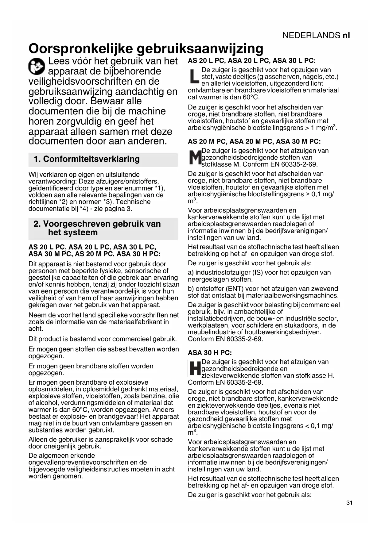 Oorspronkelijke gebruiksaanwijzing Lees vóór het gebruik van het apparaat de bijbehorende veiligheidsvoorschriften en de gebruiksaanwijzing aandachtig en volledig door. Bewaar alle documenten die bij de machine horen zorgvuldig en geef het apparaat alleen samen met deze documenten door aan anderen. Wij verklaren op eigen en uitsluitende verantwoording: Deze afzuigers/ontstoffers, geïdentificeerd door type en serienummer *1), voldoen aan alle relevante bepalingen van de richtlijnen *2) en normen *3). Technische documentatie bij *4) - zie pagina 3. AS 20 L PC, ASA 20 L PC, ASA 30 L PC, ASA 30 M PC, AS 20 M PC, ASA 30 H PC: Dit apparaat is niet bestemd voor gebruik door personen met beperkte fysieke, sensorische of geestelijke capaciteiten of die gebrek aan ervaring en/of kennis hebben, tenzij zij onder toezicht staan van een persoon die verantwoordelijk is voor hun veiligheid of van hem of haar aanwijzingen hebben gekregen over het gebruik van het apparaat. Neem de voor het land specifieke voorschriften net zoals de informatie van de materiaalfabrikant in acht. Dit product is bestemd voor commercieel gebruik. Er mogen geen stoffen die asbest bevatten worden opgezogen. Er mogen geen brandbare stoffen worden opgezogen. Er mogen geen brandbare of explosieve oplosmiddelen, in oplosmiddel gedrenkt materiaal, explosieve stoffen, vloeistoffen, zoals benzine, olie of alcohol, verdunningsmiddelen of materiaal dat warmer is dan 60°C, worden opgezogen. Anders bestaat er explosie- en brandgevaar! Het apparaat mag niet in de buurt van ontvlambare gassen en substanties worden gebruikt. Alleen de gebruiker is aansprakelijk voor schade door oneigenlijk gebruik. De algemeen erkende ongevallenpreventievoorschriften en de bijgevoegde veiligheidsinstructies moeten in acht worden genomen. AS 20 L PC, ASA 20 L PC, ASA 30 L PC: De zuiger is geschikt voor het opzuigen van stof, vaste deeltjes (glasscherven, nagels, etc.) en allerlei vloeistoffen, uitgezonderd licht ontvlambare en brandbare vloeistoffen en materiaal dat warmer is dan 60°C. De zuiger is geschikt voor het afscheiden van droge, niet brandbare stoffen, niet brandbare vloeistoffen, houtstof en gevaarlijke stoffen met arbeidshygiënische blootstellingsgrens > 1 mg/m³. AS 20 M PC, ASA 20 M PC, ASA 30 M PC: De zuiger is geschikt voor het afzuigen van gezondheidsbedreigende stoffen van stofklasse M. Conform EN 60335-2-69. De zuiger is geschikt voor het afscheiden van droge, niet brandbare stoffen, niet brandbare vloeistoffen, houtstof en gevaarlijke stoffen met arbeidshygiënische blootstellingsgrens ≥ 0,1 mg/ m³. Voor arbeidsplaatsgrenswaarden en kankerverwekkende stoffen kunt u de lijst met arbeidsplaatsgrenswaarden raadplegen of informatie inwinnen bij de bedrijfsverenigingen/ instellingen van uw land. Het resultaat van de stoftechnische test heeft alleen betrekking op het af- en opzuigen van droge stof. De zuiger is geschikt voor het gebruik als: a) industriestofzuiger (IS) voor het opzuigen van neergeslagen stoffen. b) ontstoffer (ENT) voor het afzuigen van zwevend stof dat ontstaat bij materiaalbewerkingsmachines. De zuiger is geschikt voor belasting bij commercieel gebruik, bijv. in ambachtelijke of installatiebedrijven, de bouw- en industriële sector, werkplaatsen, voor schilders en stukadoors, in de meubelindustrie of houtbewerkingsbedrijven. Conform EN 60335-2-69. ASA 30 H PC: De zuiger is geschikt voor het afzuigen van gezondheidsbedreigende en ziekteverwekkende stoffen van stofklasse H. Conform EN 60335-2-69. De zuiger is geschikt voor het afscheiden van droge, niet brandbare stoffen, kankerverwekkende en ziekteverwekkende deeltjes, evenals niet brandbare vloeistoffen, houtstof en voor de gezondheid gevaarlijke stoffen met arbeidshygiënische blootstellingsgrens < 0,1 mg/ m³. Voor arbeidsplaatsgrenswaarden en kankerverwekkende stoffen kunt u de lijst met arbeidsplaatsgrenswaarden raadplegen of informatie inwinnen bij de bedrijfsverenigingen/ instellingen van uw land. Het resultaat van de stoftechnische test heeft alleen betrekking op het af- en opzuigen van droge stof. De zuiger is geschikt voor het gebruik als: