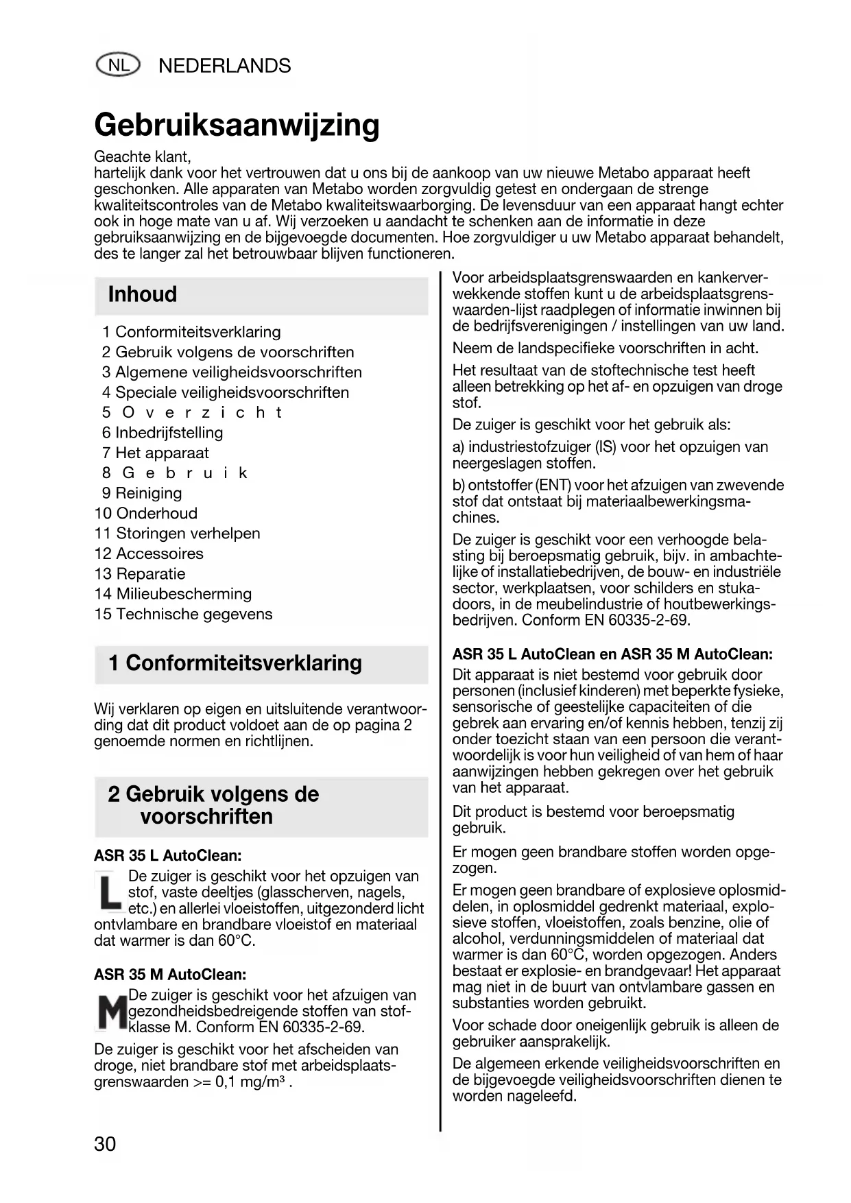 1 Conformiteitsverklaring 2 Gebruik volgens de voorschriften 3 Algemene veiligheidsvoorschriften 4 Speciale veiligheidsvoorschriften 5Overzicht 6 Inbedrijfstelling 7 Het apparaat 8Gebruik 9 Reiniging 10 Onderhoud 11 Storingen verhelpen 12 Accessoires 13 Reparatie 14 Milieubescherming 15 Technische gegevens Wij verklaren op eigen en uitsluitende verantwoor- ding dat dit product voldoet aan de op pagina 2 genoemde normen en richtlijnen. ASR 35 L AutoClean: De zuiger is geschikt voor het opzuigen van stof, vaste deeltjes (glasscherven, nagels, etc.) en allerlei vloeistoffen, uitgezonderd licht ontvlambare en brandbare vloeistof en materiaal dat warmer is dan 60°C. ASR 35 M AutoClean: De zuiger is geschikt voor het afzuigen van gezondheidsbedreigende stoffen van stof- klasse M. Conform EN 60335-2-69. De zuiger is geschikt voor het afscheiden van droge, niet brandbare stof met arbeidsplaats- grenswaarden >= 0,1 mg/m³ . Voor arbeidsplaatsgrenswaarden en kankerver- wekkende stoffen kunt u de arbeidsplaatsgrens- waarden-lijst raadplegen of informatie inwinnen bij de bedrijfsverenigingen / instellingen van uw land. Neem de landspecifieke voorschriften in acht. Het resultaat van de stoftechnische test heeft alleen betrekking op het af- en opzuigen van droge stof. De zuiger is geschikt voor het gebruik als: a) industriestofzuiger (IS) voor het opzuigen van neergeslagen stoffen. b) ontstoffer (ENT) voor het afzuigen van zwevende stof dat ontstaat bij materiaalbewerkingsma- chines. De zuiger is geschikt voor een verhoogde bela- sting bij beroepsmatig gebruik, bijv. in ambachte- lijke of installatiebedrijven, de bouw- en industriële sector, werkplaatsen, voor schilders en stuka- doors, in de meubelindustrie of houtbewerkings- bedrijven. Conform EN 60335-2-69. ASR 35 L AutoClean en ASR 35 M AutoClean: Dit apparaat is niet bestemd voor gebruik door personen (inclusief kinderen) met beperkte fysieke, sensorische of geestelijke capaciteiten of die gebrek aan ervaring en/of kennis hebben, tenzij zij onder toezicht staan van een persoon die verant- woordelijk is voor hun veiligheid of van hem of haar aanwijzingen hebben gekregen over het gebruik van het apparaat. Dit product is bestemd voor beroepsmatig gebruik. Er mogen geen brandbare stoffen worden opge- zogen. Er mogen geen brandbare of explosieve oplosmid- delen, in oplosmiddel gedrenkt materiaal, explo- sieve stoffen, vloeistoffen, zoals benzine, olie of alcohol, verdunningsmiddelen of materiaal dat warmer is dan 60°C, worden opgezogen. Anders bestaat er explosie- en brandgevaar! Het apparaat mag niet in de buurt van ontvlambare gassen en substanties worden gebruikt. Voor schade door oneigenlijk gebruik is alleen de gebruiker aansprakelijk. De algemeen erkende veiligheidsvoorschriften en de bijgevoegde veiligheidsvoorschriften dienen te worden nageleefd. Gebruiksaanwijzing Geachte klant, hartelijk dank voor het vertrouwen dat u ons bij de aankoop van uw nieuwe Metabo apparaat heeft geschonken. Alle apparaten van Metabo worden zorgvuldig getest en ondergaan de strenge kwaliteitscontroles van de Metabo kwaliteitswaarborging. De levensduur van een apparaat hangt echter ook in hoge mate van u af. Wij verzoeken u aandacht te schenken aan de informatie in deze gebruiksaanwijzing en de bijgevoegde documenten. Hoe zorgvuldiger u uw Metabo apparaat behandelt, des te langer zal het betrouwbaar blijven functioneren. Inhoud 1 Conformiteitsverklaring 2 Gebruik volgens de voorschriften 17027067_0711 ASR 35 L_M AutoClean ENTWURF.book Seite 30 Montag, 25. Juli 2011 4:46 16NEDERLANDS