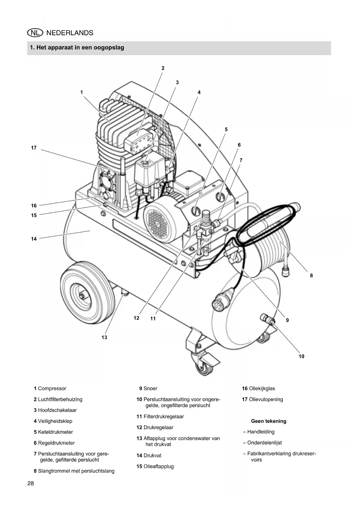 Voer nooit zich herstellingen aan het apparaat uit! Herstellingen van compressoren, drukvaten en persluchtgereedschap mogenuitsuitend door gekwalificiered personeel uitgevoerd worden.
