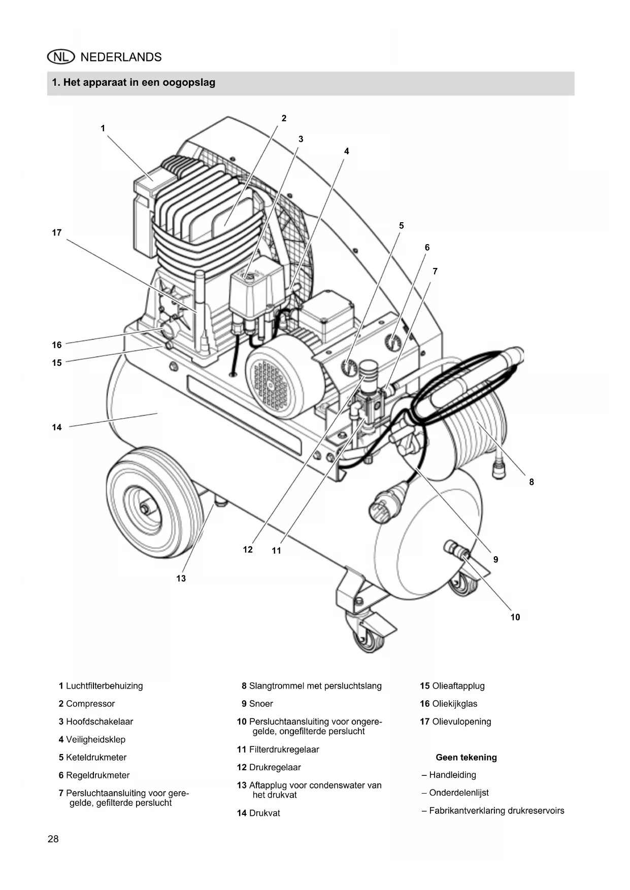 1 Luchtfilterbehuizing 2 Compressor 3 Hoofdschakelaar 4 Veiligheidsklep 5 Keteldrukmeter 6 Regeldrukmeter 7 Persluchtaansluiting voor gere- gelde, gefilterde perslucht 8 Slangtrommel met persluchtslang 9 Snoer 10 Persluchtaansluiting voor ongere- gelde, ongefilterde perslucht 11 Filterdrukregelaar 12 Drukregelaar 13 Aftapplug voor condenswater van het drukvat 14 Drukvat 15 Olieaftapplug 16 Oliekijkglas 17 Olievulopening Geen tekening – Handleiding – Onderdelenlijst – Fabrikantverklaring drukreservoirs XK0017H2.fm Handleiding NEDERLANDS29 NEDERLANDS