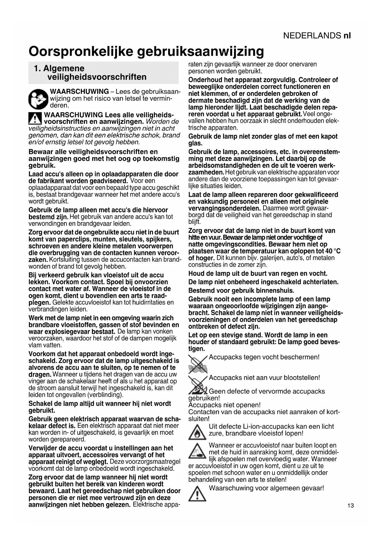 WAARSCHUWING – Lees de gebruiksaan- wijzing om het risico van letsel te vermin- deren. WAARSCHUWING Lees alle veiligheids- voorschriften en aanwijzingen. Worden de veiligheidsinstructies en aanwijzingen niet in acht genomen, dan kan dit een elektrische schok, brand en/of ernstig letsel tot gevolg hebben. Bewaar alle veiligheidsvoorschriften en aanwijzingen goed met het oog op toekomstig gebruik. Laad accu's alleen op in oplaadapparaten die door de fabrikant worden geadviseerd. Voor een oplaadapparaat dat voor een bepaald type accu geschikt is, bestaat brandgevaar wanneer het met andere accu's wordt gebruikt. Gebruik de lamp alleen met accu's die hiervoor bestemd zijn. Het gebruik van andere accu's kan tot verwondingen en brandgevaar leiden. Zorg ervoor dat de ongebruikte accu niet in de buurt komt van paperclips, munten, sleutels, spijkers, schroeven en andere kleine metalen voorwerpen die overbrugging van de contacten kunnen veroor- zaken. Kortsluiting tussen de accucontacten kan brand- wonden of brand tot gevolg hebben. Bij verkeerd gebruik kan vloeistof uit de accu lekken. Voorkom contact. Spoel bij onvoorzien contact met water af. Wanneer de vloeistof in de ogen komt, dient u bovendien een arts te raad- plegen. Gelekte accuvloeistof kan tot huidirritaties en verbrandingen leiden. Werk met de lamp niet in een omgeving waarin zich brandbare vloeistoffen, gassen of stof bevinden en waar explosiegevaar bestaat. De lamp kan vonken veroorzaken, waardoor het stof of de dampen mogelijk vlam vatten. Voorkom dat het apparaat onbedoeld wordt inge- schakeld. Zorg ervoor dat de lamp uitgeschakeld is alvorens de accu aan te sluiten, op te nemen of te dragen. Wanneer u tijdens het dragen van de accu uw vinger aan de schakelaar heeft of als u het apparaat op de stroom aansluit terwijl het ingeschakeld is, kan dit leiden tot ongevallen (verblinding). Schakel de lamp altijd uit wanneer hij niet wordt gebruikt. Gebruik geen elektrisch apparaat waarvan de scha- kelaar defect is. Een elektrisch apparaat dat niet meer kan worden in- of uitgeschakeld, is gevaarlijk en moet worden gerepareerd. Verwijder de accu voordat u instellingen aan het apparaat uitvoert, accessoires vervangt of het apparaat reinigt of weglegt. Deze voorzorgsmaatregel voorkomt dat de lamp onbedoeld wordt ingeschakeld. Zorg ervoor dat de lamp wanneer hij niet wordt gebruikt buiten het bereik van kinderen wordt bewaard. Laat het gereedschap niet gebruiken door personen die er niet mee vertrouwd zijn en deze aanwijzingen niet hebben gelezen. Elektrische appa- raten zijn gevaarlijk wanneer ze door onervaren personen worden gebruikt. Onderhoud het apparaat zorgvuldig. Controleer of beweeglijke onderdelen correct functioneren en niet klemmen, of er onderdelen gebroken of dermate beschadigd zijn dat de werking van de lamp hieronder lijdt. Laat beschadigde delen repa- reren voordat u het apparaat gebruikt. Veel onge- vallen hebben hun oorzaak in slecht onderhouden elek- trische apparaten. Gebruik de lamp niet zonder glas of met een kapot glas. Gebruik de lamp, accessoires, etc. in overeenstem- ming met deze aanwijzingen. Let daarbij op de arbeidsomstandigheden en de uit te voeren werk- zaamheden. Het gebruik van elektrische apparaten voor andere dan de voorziene toepassingen kan tot gevaar- lijke situaties leiden. Laat de lamp alleen repareren door gekwalificeerd en vakkundig personeel en alleen met originele vervangingsonderdelen. Daarmee wordt gewaar- borgd dat de veiligheid van het gereedschap in stand blijft. Zorg ervoor dat de lamp niet in de buurt komt van hitte en vuur. Bewaar de lamp niet onder vochtige of natte omgevingscondities. Bewaar hem niet op plaatsen waar de temperatuur kan oplopen tot 40 °C of hoger. Dit kunnen bijv. galerijen, auto's, of metalen constructies in de zomer zijn. Houd de lamp uit de buurt van regen en vocht. De lamp niet onbeheerd ingeschakeld achterlaten. Bestemd voor gebruik binnenshuis. Gebruik nooit een incomplete lamp of een lamp waaraan ongeoorloofde wijzigingen zijn aange- bracht. Schakel de lamp niet in wanneer veiligheids- voorzieningen of onderdelen van het gereedschap ontbreken of defect zijn. Let op een stevige stand. Wordt de lamp in een houder of standaard gebruikt: De lamp goed beves- tigen. Accupacks tegen vocht beschermen! Accupacks niet aan vuur blootstellen! Geen defecte of vervormde accupacks gebruiken! Accupacks niet openen! Contacten van de accupacks niet aanraken of kort- sluiten! Uit defecte Li-ion-accupacks kan een licht zure, brandbare vloeistof lopen! Wanneer er accuvloeistof naar buiten loopt en met de huid in aanraking komt, deze onmiddel- lijk afspoelen met overvloedig water. Wanneer er accuvloeistof in uw ogen komt, dient u ze uit te spoelen met schoon water en u onmiddellijk onder behandeling van een arts te stellen! Waarschuwing voor algemeen gevaar! Oorspronkelijke gebruiksaanwijzing