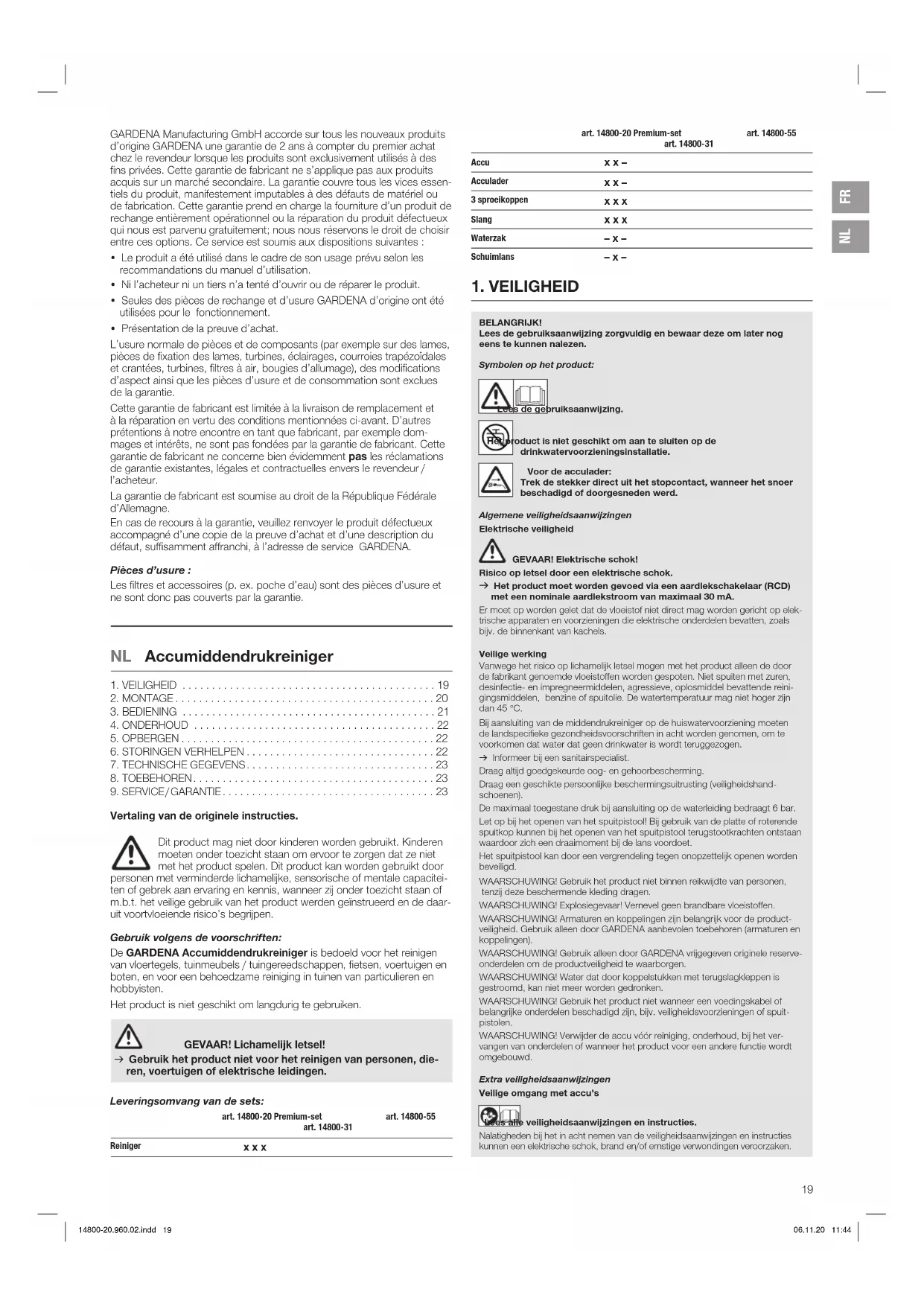Vertaling van de originele instructies. Dit product mag niet door kinderen worden gebruikt. Kinderen moeten onder toezicht staan om ervoor te zorgen dat ze niet met het product spelen. Dit product kan worden gebruikt door personen met verminderde lichamelijke, sensorische of mentale capacitei- ten of gebrek aan ervaring en kennis, wanneer zij onder toezicht staan of m.b.t. het veilige gebruik van het product werden geïnstrueerd en de daar- uit voortvloeiende risico’s begrijpen. Gebruik volgens de voorschriften: De GARDENA Accumiddendrukreiniger is bedoeld voor het reinigen van vloertegels, tuinmeubels / tuingereedschappen, fietsen, voertuigen en boten, en voor een behoedzame reiniging in tuinen van particulieren en hobbyisten. Het product is niet geschikt om langdurig te gebruiken. GEVAAR! Lichamelijk letsel! v Gebruik het product niet voor het reinigen van personen, die- ren, voertuigen of elektrische leidingen. Leveringsomvang van de sets: art. 14800-20 Premium-set art. 14800-31 art. 14800-55 Reiniger x x x art. 14800-20 Premium-set art. 14800-31 art. 14800-55 Accu x x – Acculader x x – 3 sproeikoppen x x x Slang x x x Waterzak – x – Schuimlans – x – BELANGRIJK! Lees de gebruiksaanwijzing zorgvuldig en bewaar deze om later nog eens te kunnen nalezen. Symbolen op het product: Lees de gebruiksaanwijzing. Het product is niet geschikt om aan te sluiten op de drinkwatervoorzieningsinstallatie. Voor de acculader: Trek de stekker direct uit het stopcontact, wanneer het snoer beschadigd of doorgesneden werd. Algemene veiligheidsaanwijzingen Elektrische veiligheid GEVAAR! Elektrische schok! Risico op letsel door een elektrische schok. v Het product moet worden gevoed via een aardlekschakelaar (RCD) met een nominale aardlekstroom van maximaal 30 mA. Er moet op worden gelet dat de vloeistof niet direct mag worden gericht op elek- trische apparaten en voorzieningen die elektrische onderdelen bevatten, zoals bijv. de binnenkant van kachels. Veilige werking Vanwege het risico op lichamelijk letsel mogen met het product alleen de door de fabrikant genoemde vloeistoffen worden gespoten. Niet spuiten met zuren, desinfectie- en impregneermiddelen, agressieve, oplosmiddel bevattende reini- gingsmiddelen, benzine of spuitolie. De watertemperatuur mag niet hoger zijn dan 45 °C. Bij aansluiting van de middendrukreiniger op de huiswatervoorziening moeten de landspecifieke gezondheidsvoorschriften in acht worden genomen, om te voorkomen dat water dat geen drinkwater is wordt teruggezogen. v Informeer bij een sanitairspecialist. Draag altijd goedgekeurde oog- en gehoorbescherming. Draag een geschikte persoonlijke beschermingsuitrusting (veiligheidshand- schoenen). De maximaal toegestane druk bij aansluiting op de waterleiding bedraagt 6 bar. Let op bij het openen van het spuitpistool! Bij gebruik van de platte of roterende spuitkop kunnen bij het openen van het spuitpistool terugstootkrachten ontstaan waardoor zich een draaimoment bij de lans voordoet. Het spuitpistool kan door een vergrendeling tegen onopzettelijk openen worden beveiligd. WAARSCHUWING! Gebruik het product niet binnen reikwijdte van personen, tenzij deze beschermende kleding dragen. WAARSCHUWING! Explosiegevaar! Vernevel geen brandbare vloeistoffen. WAARSCHUWING! Armaturen en koppelingen zijn belangrijk voor de product- veiligheid. Gebruik alleen door GARDENA aanbevolen toebehoren (armaturen en koppelingen). WAARSCHUWING! Gebruik alleen door GARDENA vrijgegeven originele reserve- onderdelen om de productveiligheid te waarborgen. WAARSCHUWING! Water dat door koppelstukken met terugslagkleppen is gestroomd, kan niet meer worden gedronken. WAARSCHUWING! Gebruik het product niet wanneer een voedingskabel of belangrijke onderdelen beschadigd zijn, bijv. veiligheidsvoorzieningen of spuit- pistolen. WAARSCHUWING! Verwijder de accu vóór reiniging, onderhoud, bij het ver- vangen van onderdelen of wanneer het product voor een andere functie wordt omgebouwd. Extra veiligheidsaanwijzingen Veilige omgang met accu’s Lees alle veiligheidsaanwijzingen en instructies. Nalatigheden bij het in acht nemen van de veiligheidsaanwijzingen en instructies kunnen een elektrische schok, brand en/of ernstige verwondingen veroorzaken.
