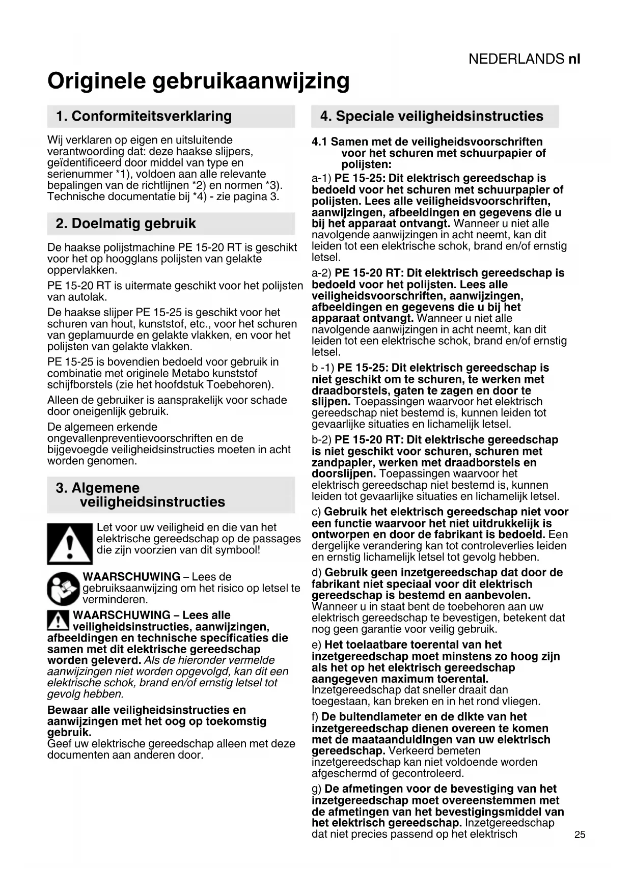 Originele gebruikaanwijzing Wij verklaren op eigen en uitsluitende verantwoording dat: deze haakse slijpers, geïdentificeerd door middel van type en serienummer *1), voldoen aan alle relevante bepalingen van de richtlijnen *2) en normen *3). Technische documentatie bij *4) - zie pagina 3. De haakse polijstmachine PE 15-20 RT is geschikt voor het op hoogglans polijsten van gelakte oppervlakken. PE 15-20 RT is uitermate geschikt voor het polijsten van autolak. De haakse slijper PE 15-25 is geschikt voor het schuren van hout, kunststof, etc., voor het schuren van geplamuurde en gelakte vlakken, en voor het polijsten van gelakte vlakken. PE 15-25 is bovendien bedoeld voor gebruik in combinatie met originele Metabo kunststof schijfborstels (zie het hoofdstuk Toebehoren). Alleen de gebruiker is aansprakelijk voor schade door oneigenlijk gebruik. De algemeen erkende ongevallenpreventievoorschriften en de bijgevoegde veiligheidsinstructies moeten in acht worden genomen. Let voor uw veiligheid en die van het elektrische gereedschap op de passages die zijn voorzien van dit symbool! WAARSCHUWING – Lees de gebruiksaanwijzing om het risico op letsel te verminderen. WAARSCHUWING – Lees alle veiligheidsinstructies, aanwijzingen, afbeeldingen en technische specificaties die samen met dit elektrische gereedschap worden geleverd. Als de hieronder vermelde aanwijzingen niet worden opgevolgd, kan dit een elektrische schok, brand en/of ernstig letsel tot gevolg hebben. Bewaar alle veiligheidsinstructies en aanwijzingen met het oog op toekomstig gebruik. Geef uw elektrische gereedschap alleen met deze documenten aan anderen door.