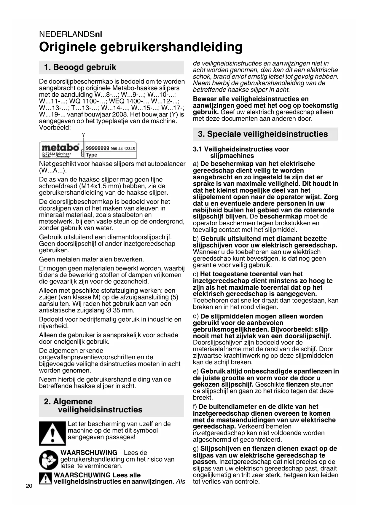 - -; W - vanaf bouwjaar 2008. Het bouwjaar (Y) is aangegeven op het typeplaatje van de machine. Voorbeeld: Niet geschikt voor haakse slijpers met autobalancer (W A ). De as van de haakse slijper mag geen fijne schroefdraad (M14x1,5 mm) hebben, zie de gebruikershandleiding van de haakse slijper. De doorslijpbeschermkap is bedoeld voor het doorslijpen van of het maken van sleuven in mineraal materiaal, zoals staalbeton en metselwerk, bij een vaste steun op de ondergrond, zonder gebruik van water. Gebruik uitsluitend een diamantdoorslijpschijf. Geen doorslijpschijf of ander inzetgereedschap gebruiken. Geen metalen materialen bewerken. Er mogen geen materialen bewerkt worden, waarbij tijdens de bewerking stoffen of dampen vrijkomen die gevaarlijk zijn voor de gezondheid. Alleen met geschikte stofafzuiging werken: een zuiger (van klasse M) op de afzuigaansluiting (5) aansluiten. Wij raden het gebruik aan van een antistatische zuigslang Ø 35 mm. Bedoeld voor bedrijfsmatig gebruik in industrie en nijverheid. Alleen de gebruiker is aansprakelijk voor schade door oneigenlijk gebruik. De algemeen erkende ongevallenpreventievoorschriften en de bijgevoegde veiligheidsinstructies moeten in acht worden genomen. Neem hierbij de gebruikershandleiding van de betreffende haakse slijper in acht. Let ter bescherming van uzelf en de machine op de met dit symbool aangegeven passages! WAARSCHUWING – Lees de gebruikershandleiding om het risico van letsel te verminderen. WAARSCHUWING Lees alle veiligheidsinstructies en aanwijzingen. Als de veiligheidsinstructies en aanwijzingen niet in acht worden genomen, dan kan dit een elektrische schok, brand en/of ernstig letsel tot gevolg hebben. Neem hierbij de gebruikershandleiding van de betreffende haakse slijper in acht. Bewaar alle veiligheidsinstructies en aanwijzingen goed met het oog op toekomstig gebruik. Geef uw elektrisch gereedschap alleen met deze documenten aan anderen door. p. 19