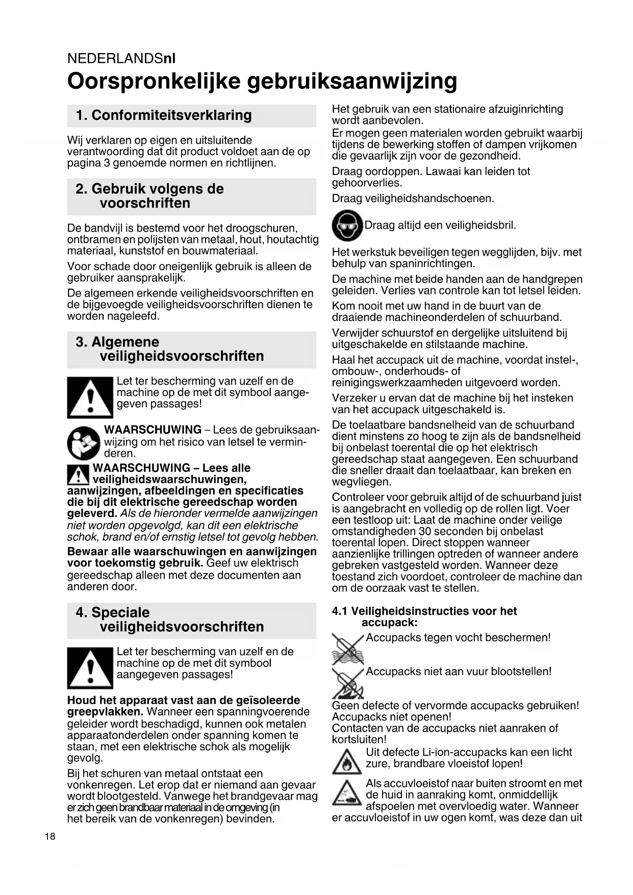 Oorspronkelijke gebruiksaanwijzing Wij verklaren op eigen en uitsluitende verantwoording dat dit product voldoet aan de op pagina 3 genoemde normen en richtlijnen. De bandvijl is bestemd voor het droogschuren, ontbramen en polijsten van metaal, hout, houtachtig materiaal, kunststof en bouwmateriaal. Voor schade door oneigenlijk gebruik is alleen de gebruiker aansprakelijk. De algemeen erkende veiligheidsvoorschriften en de bijgevoegde veiligheidsvoorschriften dienen te worden nageleefd. Let ter bescherming van uzelf en de machine op de met dit symbool aange- geven passages! WAARSCHUWING – Lees de gebruiksaan- wijzing om het risico van letsel te vermin- deren. WAARSCHUWING – Lees alle veiligheidswaarschuwingen, aanwijzingen, afbeeldingen en specificaties die bij dit elektrische gereedschap worden geleverd. Als de hieronder vermelde aanwijzingen niet worden opgevolgd, kan dit een elektrische schok, brand en/of ernstig letsel tot gevolg hebben. Bewaar alle waarschuwingen en aanwijzingen voor toekomstig gebruik. Geef uw elektrisch gereedschap alleen met deze documenten aan anderen door. Let ter bescherming van uzelf en de machine op de met dit symbool aangegeven passages! Houd het apparaat vast aan de geïsoleerde greepvlakken. Wanneer een spanningvoerende geleider wordt beschadigd, kunnen ook metalen apparaatonderdelen onder spanning komen te staan, met een elektrische schok als mogelijk gevolg. Bij het schuren van metaal ontstaat een vonkenregen. Let erop dat er niemand aan gevaar wordt blootgesteld. Vanwege het brandgevaar mag er zich geen brandbaar materiaal in de omgeving (in het bereik van de vonkenregen) bevinden. Het gebruik van een stationaire afzuiginrichting wordt aanbevolen. Er mogen geen materialen worden gebruikt waarbij tijdens de bewerking stoffen of dampen vrijkomen die gevaarlijk zijn voor de gezondheid. Draag oordoppen. Lawaai kan leiden tot gehoorverlies. Draag veiligheidshandschoenen. Draag altijd een veiligheidsbril. Het werkstuk beveiligen tegen wegglijden, bijv. met behulp van spaninrichtingen. De machine met beide handen aan de handgrepen geleiden. Verlies van controle kan tot letsel leiden. Kom nooit met uw hand in de buurt van de draaiende machineonderdelen of schuurband. Verwijder schuurstof en dergelijke uitsluitend bij uitgeschakelde en stilstaande machine. Haal het accupack uit de machine, voordat instel-, ombouw-, onderhouds- of reinigingswerkzaamheden uitgevoerd worden. Verzeker u ervan dat de machine bij het insteken van het accupack uitgeschakeld is. De toelaatbare bandsnelheid van de schuurband dient minstens zo hoog te zijn als de bandsnelheid bij onbelast toerental die op het elektrisch gereedschap staat aangegeven. Een schuurband die sneller draait dan toelaatbaar, kan breken en wegvliegen. Controleer voor gebruik altijd of de schuurband juist is aangebracht en volledig op de rollen ligt. Voer een testloop uit: Laat de machine onder veilige omstandigheden 30 seconden bij onbelast toerental lopen. Direct stoppen wanneer aanzienlijke trillingen optreden of wanneer andere gebreken vastgesteld worden. Wanneer deze toestand zich voordoet, controleer de machine dan om de oorzaak vast te stellen.