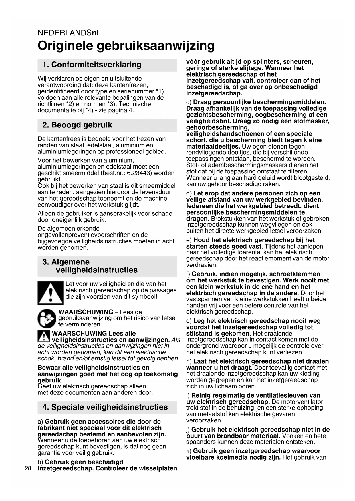 Originele gebruiksaanwijzing Wij verklaren op eigen en uitsluitende verantwoording dat: deze kantenfrezen, geïdentificeerd door type en serienummer *1), voldoen aan alle relevante bepalingen van de richtlijnen *2) en normen *3). Technische documentatie bij *4) - zie pagina 4. De kantenfrees is bedoeld voor het frezen van randen van staal, edelstaal, aluminium en aluminiumlegeringen op professioneel gebied. Voor het bewerken van aluminium, aluminiumlegeringen en edelstaal moet een geschikt smeermiddel (best.nr.: 6.23443) worden gebruikt. Ook bij het bewerken van staal is dit smeermiddel aan te raden, aangezien hierdoor de levensduur van het gereedschap toeneemt en de machine eenvoudiger over het werkstuk glijdt. Alleen de gebruiker is aansprakelijk voor schade door oneigenlijk gebruik. De algemeen erkende ongevallenpreventievoorschriften en de bijgevoegde veiligheidsinstructies moeten in acht worden genomen. Let voor uw veiligheid en die van het elektrisch gereedschap op de passages die zijn voorzien van dit symbool! WAARSCHUWING – Lees de gebruiksaanwijzing om het risico van letsel te verminderen. WAARSCHUWING Lees alle veiligheidsinstructies en aanwijzingen. Als de veiligheidsinstructies en aanwijzingen niet in acht worden genomen, kan dit een elektrische schok, brand en/of ernstig letsel tot gevolg hebben. Bewaar alle veiligheidsinstructies en aanwijzingen goed met het oog op toekomstig gebruik. Geef uw elektrisch gereedschap alleen met deze documenten aan anderen door. a) Gebruik geen accessoires die door de fabrikant niet speciaal voor dit elektrisch gereedschap bestemd en aanbevolen zijn. Wanneer u de toebehoren aan uw elektrisch gereedschap kunt bevestigen, is dat nog geen garantie voor veilig gebruik. b) Gebruik geen beschadigd inzetgereedschap. Controleer de wisselplaten vóór gebruik altijd op splinters, scheuren, geringe of sterke slijtage. Wanneer het elektrisch gereedschap of het inzetgereedschap valt, controleer dan of het beschadigd is, of ga over op onbeschadigd inzetgereedschap. c) Draag persoonlijke beschermingsmiddelen. Draag afhankelijk van de toepassing volledige gezichtsbescherming, oogbescherming of een veiligheidsbril. Draag zo nodig een stofmasker, gehoorbescherming, veiligheidshandschoenen of een speciale schort, die u bescherming biedt tegen kleine materiaaldeeltjes. Uw ogen dienen tegen rondvliegende deeltjes, die bij verschillende toepassingen ontstaan, beschermd te worden. Stof- of adembeschermingsmaskers dienen het stof dat bij de toepassing ontstaat te filteren. Wanneer u lang aan hard geluid wordt blootgesteld, kan uw gehoor beschadigd raken. d) Let erop dat andere personen zich op een veilige afstand van uw werkgebied bevinden. Iedereen die het werkgebied betreedt, dient persoonlijke beschermingsmiddelen te dragen. Brokstukken van het werkstuk of gebroken inzetgereedschap kunnen wegvliegen en ook buiten het directe werkgebied letsel veroorzaken. e) Houd het elektrisch gereedschap bij het starten steeds goed vast. Tijdens het aanlopen naar het volledige toerental kan het elektrisch gereedschap door het reactiemoment van de motor verdraaien. f) Gebruik, indien mogelijk, schroefklemmen om het werkstuk te bevestigen. Werk nooit met een klein werkstuk in de ene hand en het elektrisch gereedschap in de andere. Door het vastspannen van kleine werkstukken heeft u beide handen vrij voor een betere controle van het elektrisch gereedschap. g) Leg het elektrisch gereedschap nooit weg voordat het inzetgereedschap volledig tot stilstand is gekomen. Het draaiende inzetgereedschap kan in contact komen met de ondergrond waardoor u mogelijk de controle over het elektrisch gereedschap kunt verliezen. h) Laat het elektrisch gereedschap niet draaien wanneer u het draagt. Door toevallig contact met het draaiende inzetgereedschap kan uw kleding worden gegrepen en kan het inzetgereedschap zich in uw lichaam boren.