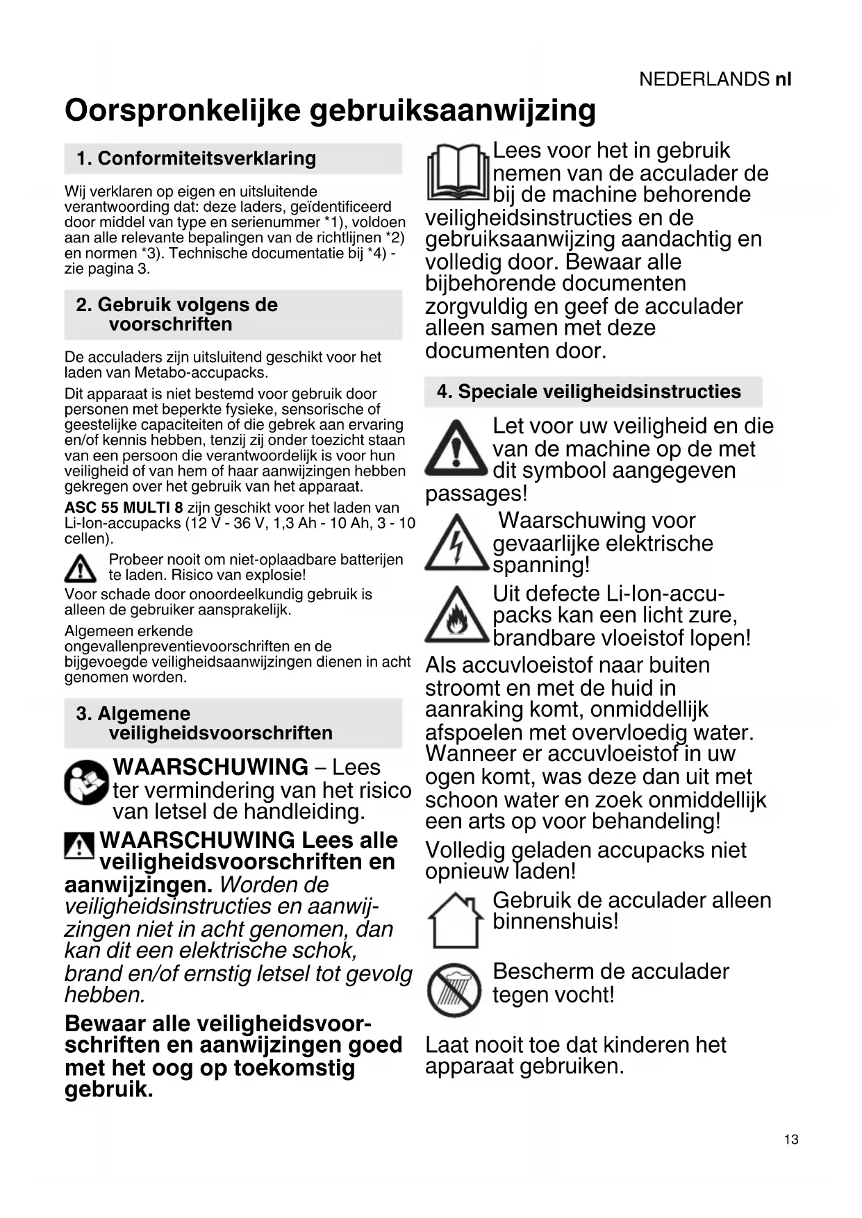 Oorspronkelijke gebruiksaanwijzing Wij verklaren op eigen en uitsluitende verantwoording dat: deze laders, geïdentificeerd door middel van type en serienummer *1), voldoen aan alle relevante bepalingen van de richtlijnen *2) en normen *3). Technische documentatie bij *4) - zie pagina 3. De acculaders zijn uitsluitend geschikt voor het laden van Metabo-accupacks. Dit apparaat is niet bestemd voor gebruik door personen met beperkte fysieke, sensorische of geestelijke capaciteiten of die gebrek aan ervaring en/of kennis hebben, tenzij zij onder toezicht staan van een persoon die verantwoordelijk is voor hun veiligheid of van hem of haar aanwijzingen hebben gekregen over het gebruik van het apparaat. ASC 55 MULTI 8 zijn geschikt voor het laden van Li-Ion-accupacks (12 V - 36 V, 1,3 Ah - 10 Ah, 3 - 10 cellen). Probeer nooit om niet-oplaadbare batterijen te laden. Risico van explosie! Voor schade door onoordeelkundig gebruik is alleen de gebruiker aansprakelijk. Algemeen erkende ongevallenpreventievoorschriften en de bijgevoegde veiligheidsaanwijzingen dienen in acht genomen worden. WAARSCHUWING – Lees ter vermindering van het risico van letsel de handleiding. WAARSCHUWING Lees alle veiligheidsvoorschriften en aanwijzingen. Worden de veiligheidsinstructies en aanwij- zingen niet in acht genomen, dan kan dit een elektrische schok, brand en/of ernstig letsel tot gevolg hebben. Bewaar alle veiligheidsvoor- schriften en aanwijzingen goed met het oog op toekomstig gebruik. Lees voor het in gebruik nemen van de acculader de bij de machine behorende veiligheidsinstructies en de gebruiksaanwijzing aandachtig en volledig door. Bewaar alle bijbehorende documenten zorgvuldig en geef de acculader alleen samen met deze documenten door. Let voor uw veiligheid en die van de machine op de met dit symbool aangegeven passages! Waarschuwing voor gevaarlijke elektrische spanning! Uit defecte Li-Ion-accu- packs kan een licht zure, brandbare vloeistof lopen! Als accuvloeistof naar buiten stroomt en met de huid in aanraking komt, onmiddellijk afspoelen met overvloedig water. Wanneer er accuvloeistof in uw ogen komt, was deze dan uit met schoon water en zoek onmiddellijk een arts op voor behandeling! Volledig geladen accupacks niet opnieuw laden! Gebruik de acculader alleen binnenshuis! Bescherm de acculader tegen vocht! Laat nooit toe dat kinderen het apparaat gebruiken.