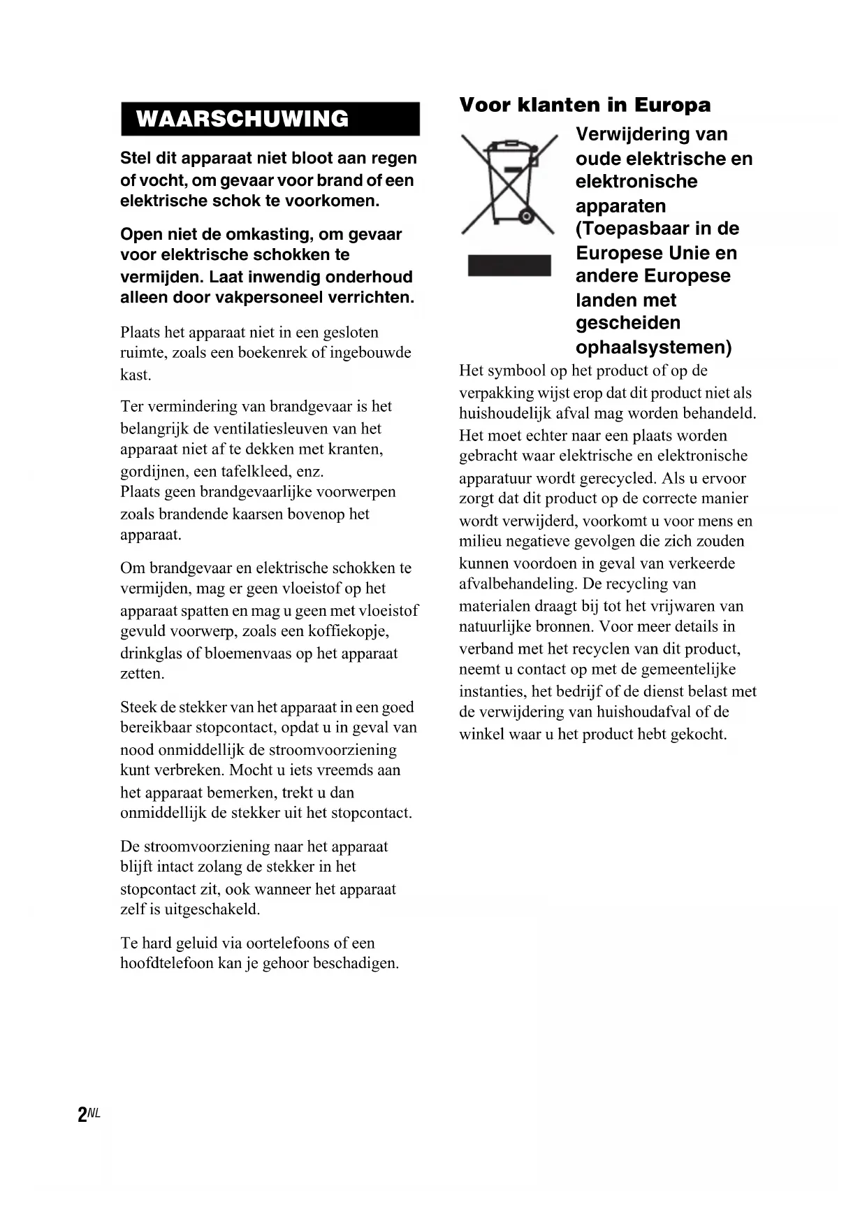 Stel dit apparaat niet bloot aan regen of vocht, om gevaar voor brand of een elektrische schok te voorkomen. Open niet de omkasting, om gevaar voor elektrische schokken te vermijden. Laat inwendig onderhoud alleen door vakpersoneel verrichten. Plaats het apparaat niet in een gesloten ruimte, zoals een boekenrek of ingebouwde kast. Ter vermindering van brandgevaar is het belangrijk de ventilatiesleuven van het apparaat niet af te dekken met kranten, gordijnen, een tafelkleed, enz. Plaats geen brandgevaarlijke voorwerpen zoals brandende kaarsen bovenop het apparaat. Om brandgevaar en elektrische schokken te vermijden, mag er geen vloeistof op het apparaat spatten en mag u geen met vloeistof gevuld voorwerp, zoals een koffiekopje, drinkglas of bloemenvaas op het apparaat zetten. Steek de stekker van het apparaat in een goed bereikbaar stopcontact, opdat u in geval van nood onmiddellijk de stroomvoorziening kunt verbreken. Mocht u iets vreemds aan het apparaat bemerken, trekt u dan onmiddellijk de stekker uit het stopcontact. De stroomvoorziening naar het apparaat blijft intact zolang de stekker in het stopcontact zit, ook wanneer het apparaat zelf is uitgeschakeld. Te hard geluid via oortelefoons of een hoofdtelefoon kan je gehoor beschadigen. Voor klanten in Europa Verwijdering van oude elektrische en elektronische apparaten (Toepasbaar in de Europese Unie en andere Europese landen met gescheiden ophaalsystemen) Het symbool op het product of op de verpakking wijst erop dat dit product niet als huishoudelijk afval mag worden behandeld. Het moet echter naar een plaats worden gebracht waar elektrische en elektronische apparatuur wordt gerecycled. Als u ervoor zorgt dat dit product op de correcte manier wordt verwijderd, voorkomt u voor mens en milieu negatieve gevolgen die zich zouden kunnen voordoen in geval van verkeerde afvalbehandeling. De recycling van materialen draagt bij tot het vrijwaren van natuurlijke bronnen. Voor meer details in verband met het recyclen van dit product, neemt u contact op met de gemeentelijke instanties, het bedrijf of de dienst belast met de verwijdering van huishoudafval of de winkel waar u het product hebt gekocht. WAARSCHUWING3