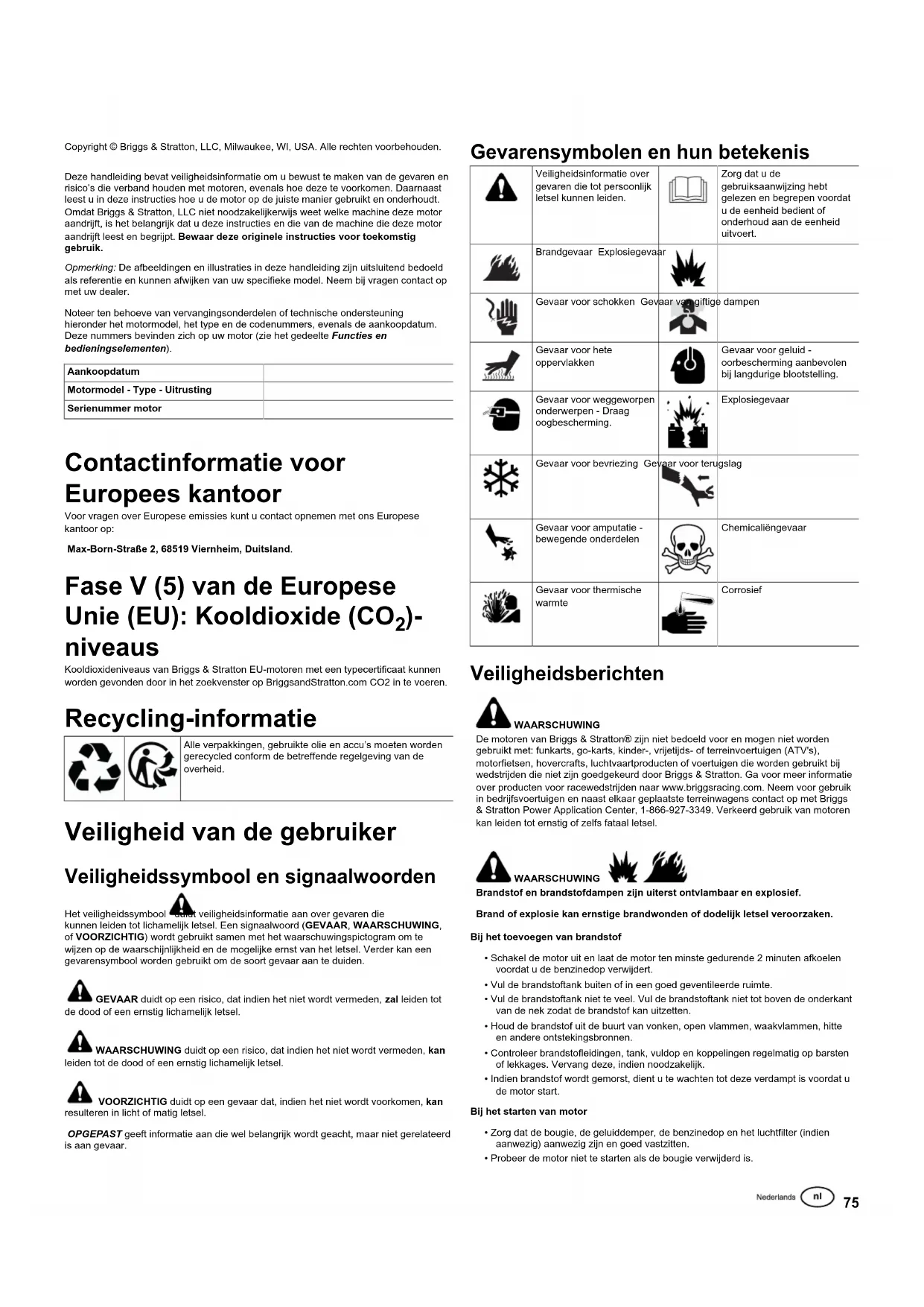 magazzinaggio dell’attrezzatura o installazione scorretta del motore. L’assistenza in garanzia è disponibile esclusivamente presso i rivenditori Briggs & Stratton autorizzati. Trovate il Centro di assistenza autorizzato più vicino sulla74 BRIGGSandSTRATTON.com mappa all’indirizzo BRIGGSandSTRATTON.COM o chiamate il 1-800-233-3723 (negli USA). 80004537 (Rev. F)75 Copyright © Briggs & Stratton, LLC, Milwaukee, WI, USA. Alle rechten voorbehouden. Deze handleiding bevat veiligheidsinformatie om u bewust te maken van de gevaren en risico’s die verband houden met motoren, evenals hoe deze te voorkomen. Daarnaast leest u in deze instructies hoe u de motor op de juiste manier gebruikt en onderhoudt. Omdat Briggs & Stratton, LLC niet noodzakelijkerwijs weet welke machine deze motor aandrijft, is het belangrijk dat u deze instructies en die van de machine die deze motor aandrijft leest en begrijpt. Bewaar deze originele instructies voor toekomstig gebruik. Opmerking:De afbeeldingen en illustraties in deze handleiding zijn uitsluitend bedoeld als referentie en kunnen afwijken van uw specifieke model. Neem bij vragen contact op met uw dealer. Noteer ten behoeve van vervangingsonderdelen of technische ondersteuning hieronder het motormodel, het type en de codenummers, evenals de aankoopdatum. Deze nummers bevinden zich op uw motor (zie het gedeelte Functies en bedieningselementen). Aankoopdatum Motormodel - Type - Uitrusting Serienummer motor Contactinformatie voor Europees kantoor Voor vragen over Europese emissies kunt u contact opnemen met ons Europese kantoor op: Max-Born-Straße 2, 68519 Viernheim, Duitsland. Fase V (5) van de Europese Unie (EU): Kooldioxide (CO