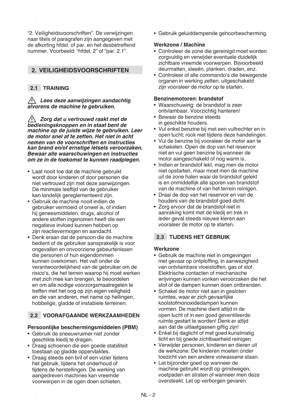 - Let bijzonder goed op wanneer de machine gebruikt wordt op grindwegen, voetpaden en straten of wanneer men deze oversteekt. Let op verborgen gevaren.NL - 3