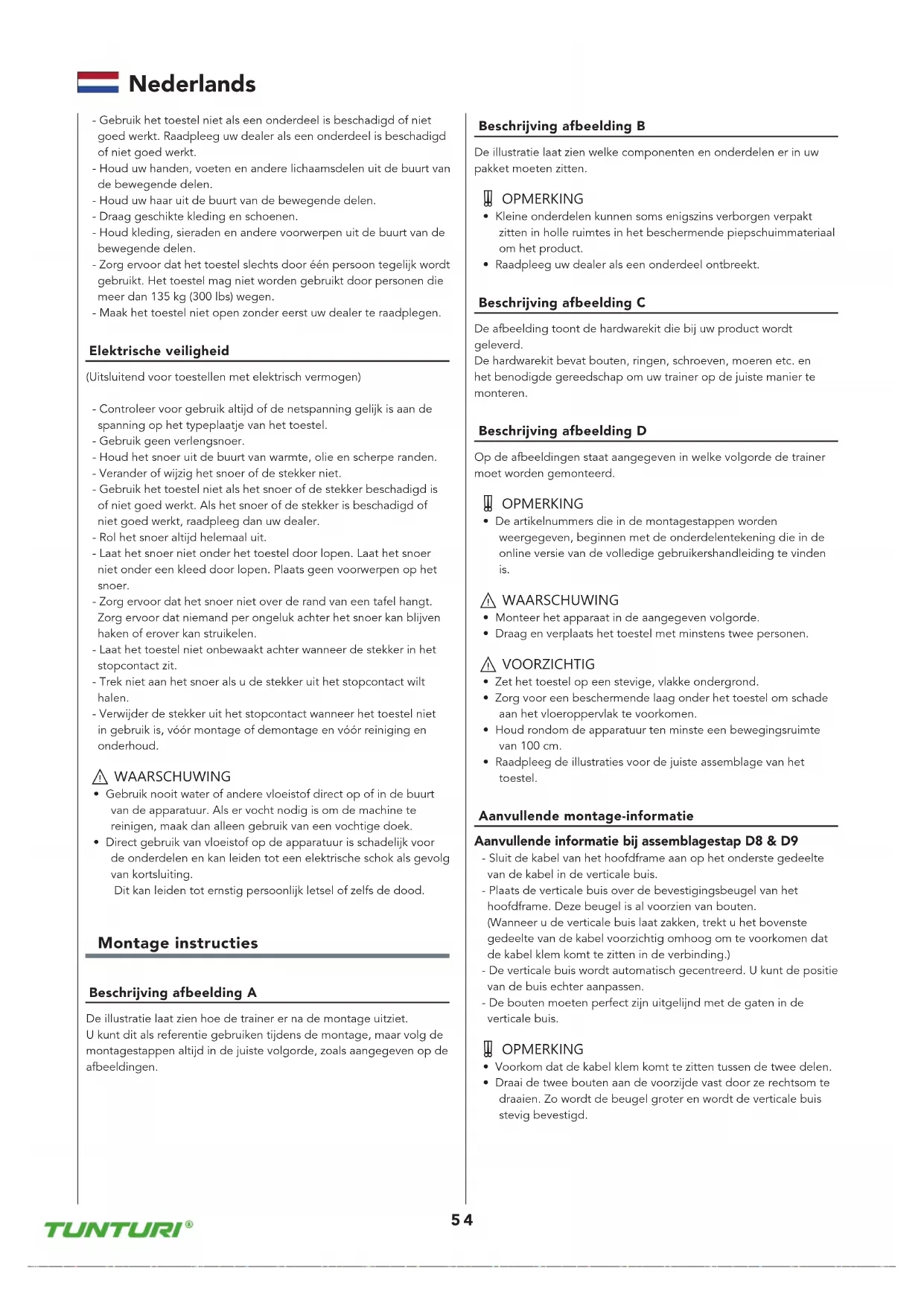 - Pour connaître les dimensions du produit et les dimensions fonctionnelles, veuillez consulter la figure G Déclaration du fabricant Tunturi Fitness BV déclare que le produit est conforme aux directives et normes suivantes : EN 957 (HA), 2014/30/EU Ce produit porte donc la marque CE 04-2020 Tunturi New Fitness BV Purmerweg 1 1311 XE Almere Pays-Bas Limite de responsabilité © 2020 Tunturi New Fitness BV Tous les droits réservés - Le produit et le manuel sont sujets à modifications - Les spécifications peuvent hanger sans préavis - Consultez notre site Web pour obtenir la dernière version du manuel d’utilisation53 Nederlands Welkom 53 Veiligheidswaarschuwingen 53 Elektrische veiligheid 54 Montage instructies 54 Beschrijving afbeelding A 54Beschrijving afbeelding B54Beschrijving afbeelding C 54Beschrijving afbeelding D 54Aanvullende montage-informatie 54 Trainingen 55 Instructies 55 Hartslag 55 Gebruik 56 Afstellen van de steunvoeten 56Afstellen van de console 56 Voeding (Fig E) 56 Console 56 Uitleg van de weergavefuncties 57 Werking van de knoppen 57 Bediening 58 Programma’s 58 Set user 58 Manueel 58 Programma proel 1 - 12 59 Hartslag gestuurd 59 Wattage gestuurd (W) 59 Gebruikersprogramma (U) 59 Recovery (Modus Recovery) 60Body Fat (Modus Body Fat) 60 Bluetooth & APP 60 Reiniging en onderhoud 60 Smeer de rail van de pedaalroller 60Defecten en storingen61 Transport en opslag 61 Aanvullende informatie 61 Garantie 61 Technische gegevens 62 Verklaring van de fabrikant 62 Disclaimer 62 Nederlands Deze Nederlandse handleiding is een vertaling van de Engelse tekst Aan deze vertaling kunnen geen rechten ontleend worden De originele Engelse tekst blijft leidend Inhoud Welkom Welkom in de wereld van Tunturi Fitness!Hartelijk dank voor uw aankoop van dit Tunturi-toestel Tunturi biedt een grote verscheidenheid aan professionele toestellen zoals crosstrainers, loopbanden, fietstrainers, roeimachines, krachtbanken, multistations en accessoires Het Tunturi-toestel is geschikt voor de hele familie, onafhankelijk van de conditie Meer informatie vindt u op de website wwwtunturicom Belangrijke Informatie Deze handleiding is een essentieel onderdeel van uw trainingsapparatuur Lees alle instructies in deze handleiding voordat u de apparatuur in gebruik neemt De volgende voorzorgsmaatregelen moeten altijd in acht worden genomen: Veiligheidswaarschuwingen ⚠ WAARSCHUWING