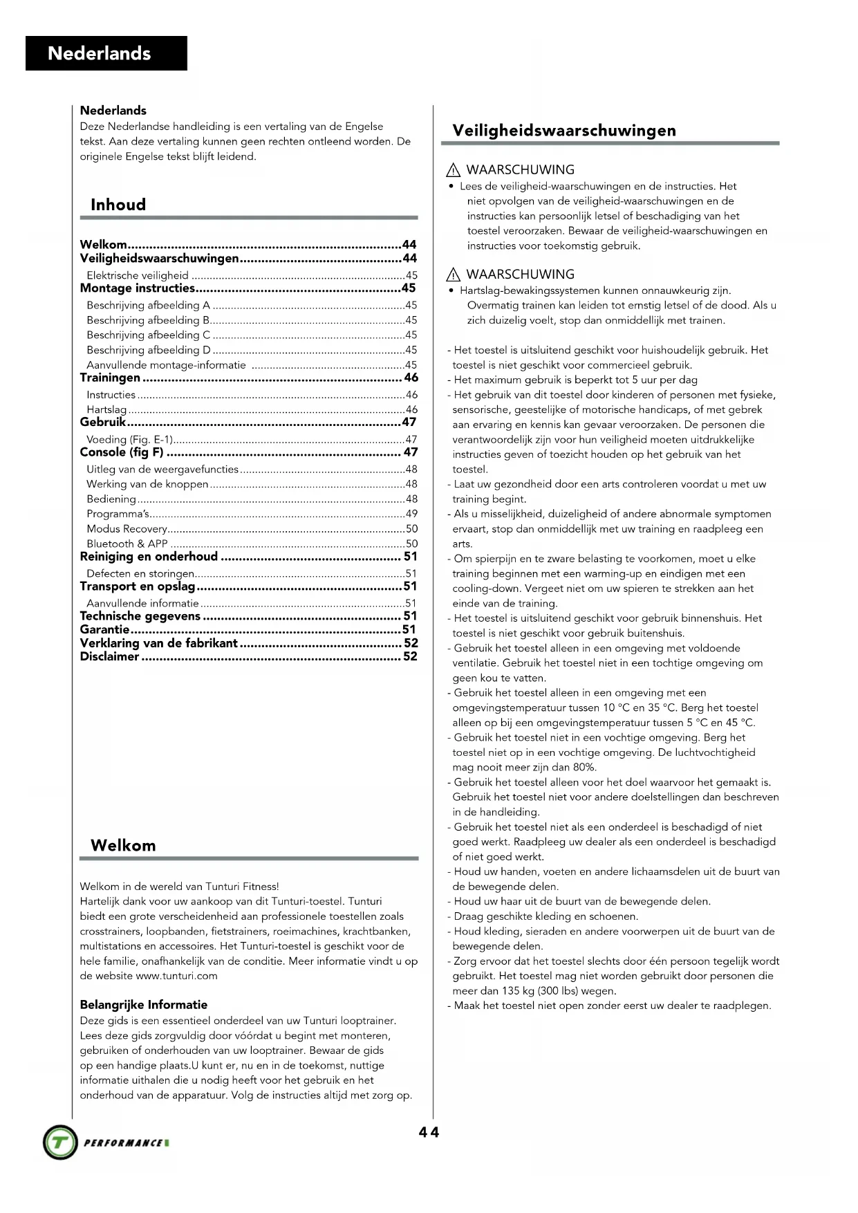 Voltage 230 AC43 Français Garantie Garantie du propriétaire d‘un équipment de Tunturi Conditions de garantie Le consommateur dispose des droits légaux accordés par la législation nationale applicable au commerce des produits de consommation courante et cette garantie ne limite ces droits en aucun cas La « Garantie du propriétaire » est valable uniquement si l’équipement est utilisé dans l’environnement correspondant à celui déterminé par Tunturi New Fitness BV L’environnement d’utilisation de chaque appareil est mentionné dans le mode d’emploi fourni avec l’appareil en question Conditions de garantie Les conditions de garantie sont applicables à compter de la date d’achat et peuvent varier selon les pays Demandez conseil à votre revendeur Étendue de la garantie En aucun cas Tunturi New Fitness BV, le revendeur ou le distributeur Tunturi ne répondra des éventuels dommages spéciaux, indirects, secondaires ou consécutifs, de quelque nature que ce soit, liés à l’utilisation de ou à l’inaptitude à utiliser cet équipement Restrictions de garantie La garantie couvre les défauts de fabrication et de matériaux dans un équipement d’origine, sorti d’usine et conditionné par Tunturi New Fitness BV La garantie couvre uniquement les défauts apparaissant lors d’une utilisation normale et conforme aux instructions du manuel du propriétaire, à condition que les instructions de montage, de maintenance et d’utilisation établies par Tunturi New Fitness BV aient été respectées Tunturi New Fitness BV et les revendeurs Tunturi ne répondent pas des défauts occasionnés par des conditions indé pendantes de leur volonté La garantie est applicable uniquement au premier acheteur et est valable uniquement dans les pays où Tunturi New Fitness BV dispose d’un distributeur agréé La garantie ne s’étend pas aux équipements de fitness ou aux pièces qui ont été modifiées sans l’autorisation de Tunturi New Fitness BV La garantie ne s’applique pas aux défauts provenant d’une usure normale, d’une utilisation inadaptée, d’une utilisation dans des conditions non prévues par le fabricant, de la corrosion ou d’un dommage intervenu lors du chargement ou du transport La garantie ne couvre pas les sons ou les bruits émis par l’équipement s’ils ne gênent pas son utilisation et s’ils ne sont pas provoqués par un dysfonctionnement La garantie ne couvre pas non plus les mesures de maintenance, telles que le nettoyage, la lubrification ou la vérification normale des pièces, ni les actions que le client peut effectuer lui-même et qui n’exigent pas particulièrement de monter/ démonter l’équipement Ces actions sont par ex¬emple le changement des compteurs, des pédales ou autres pièces similaires faciles à changer Seules les réparations sous garantie effectuées par un revendeur ou par le distributeur agréé Tunturi seront prises en charge Le non-respect des instructions décrites dans le Manuel de l’Utilisateur entraînera l’annulation de la garantie Déclaration du fabricant Tunturi Fitness BV déclare que le produit est conforme aux directives et normes suivantes : EN 957 (HB), 2014/30/EU Ce produit porte donc la marque CE 04-2020 Tunturi New Fitness BV Purmerweg 1 1311 XE Almere Pays-Bas Limite de responsabilité © 2020 Tunturi New Fitness BV Tous les droits réservés - Le produit et le manuel sont sujets à modifications - Les spécifications peuvent hanger sans préavis - Consultez notre site Web pour obtenir la dernière version du manuel d’utilisation44 Nederlands Welkom Welkom in de wereld van Tunturi Fitness!Hartelijk dank voor uw aankoop van dit Tunturi-toestel Tunturi biedt een grote verscheidenheid aan professionele toestellen zoals crosstrainers, loopbanden, fietstrainers, roeimachines, krachtbanken, multistations en accessoires Het Tunturi-toestel is geschikt voor de hele familie, onafhankelijk van de conditie Meer informatie vindt u op de website wwwtunturicom Belangrijke Informatie Deze gids is een essentieel onderdeel van uw Tunturi looptrainer Lees deze gids zorgvuldig door vóórdat u begint met monteren, gebruiken of onderhouden van uw looptrainer Bewaar de gids op een handige plaatsU kunt er, nu en in de toekomst, nuttige informatie uithalen die u nodig heeft voor het gebruik en het onderhoud van de apparatuur Volg de instructies altijd met zorg op Welkom 44 Veiligheidswaarschuwingen 44 Elektrische veiligheid 45 Montage instructies 45 Beschrijving afbeelding A 45Beschrijving afbeelding B45Beschrijving afbeelding C 45Beschrijving afbeelding D 45Aanvullende montage-informatie 45 Trainingen 46 Instructies 46 Hartslag 46 Gebruik 47 Voeding (Fig E-1) 47 Console (g F) 47 Uitleg van de weergavefuncties 48Werking van de knoppen 48 Bediening 48 Programma’s 49 Modus Recovery 50 Bluetooth & APP 50 Reiniging en onderhoud 51 Defecten en storingen51 Transport en opslag 51 Aanvullende informatie 51 Technische gegevens 51 Garantie 51 Verklaring van de fabrikant 52 Disclaimer 52 Nederlands Deze Nederlandse handleiding is een vertaling van de Engelse tekst Aan deze vertaling kunnen geen rechten ontleend worden De originele Engelse tekst blijft leidend Inhoud Veiligheidswaarschuwingen ⚠ WAARSCHUWING