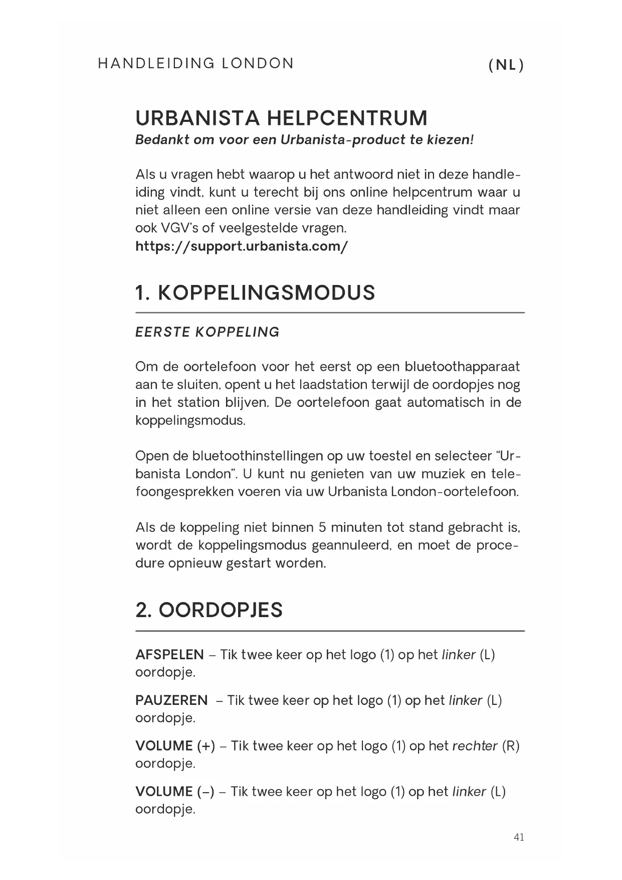 AFSPELEN – Tik twee keer op het logo (1) op het linker (L) oordopje. PAUZEREN – Tik twee keer op het logo (1) op het linker (L) oordopje. VOLUME (+) – Tik twee keer op het logo (1) op het rechter (R) oordopje. VOLUME (–) – Tik twee keer op het logo (1) op het linker (L) oordopje. HANDLEIDING LONDON (NL) URBANISTA HELPCENTRUM Bedankt om voor een Urbanista-product te kiezen! Als u vragen hebt waarop u het antwoord niet in deze handle- iding vindt, kunt u terecht bij ons online helpcentrum waar u niet alleen een online versie van deze handleiding vindt maar ook VGV’s of veelgestelde vragen. https://support.urbanista.com/42 INKOMEND GESPREK BEANTWOORDEN – Tik twee keer op het logo (1) op het linker (L) of rechter (R) oordopje. GESPREK BEËINDIGEN – Tik twee keer op het logo (1) op het linker (L) of rechter (R) oordopje. GESPREK AFWIJZEN – Tik op het logo (1) op het linker (L) of rechter (R) oordopje en houd het twee seconden vast. SIRI – Tik twee keer op het logo (1) op het rechter (R) oordopje. ACTIEVE GELUIDSONDERBEKING AAN/UIT – Tik op het logo (1) op het rechter (R) oordopje en houd het twee seconden vast. STAND OMGEVINGSGELUID AAN/UIT – Tik op het logo op het linker (L) oordopje en houd het twee seconden vast. OORDETECTIE – Ingebouwde sensoren zetten de muziek au- tomatisch stop wanneer een oordopje uit uw oor verwijderd is. De automatische afspeelfunctie wordt geactiveerd wanneer u het oortje weer in uw oor brengt, en de muziek begint weer te spelen. De aanraaktoetsfunctie wordt uitgeschakeld zodra het oortje uit uw oor verwijderd is. Telefoongesprekken worden niet beëindigd zelfs als er een oordopje uit het oor verwijderd is. BATTERIJSTATUSINDICATOR – Nadat u het deksel van het laadstation gesloten hebt, geven de indicatorlampjes van de batterij (3) de resterende batterijlading weer. WAARSCHUWING BATTERIJ BIJNA LEEG – Als de batterij bi- jna leeg is, zal u een stemmelding “batterij bijna leeg” horen en is er nog 30 minuten afspeeltijd over voordat de oortelefoon automatisch wordt uitgeschakeld.