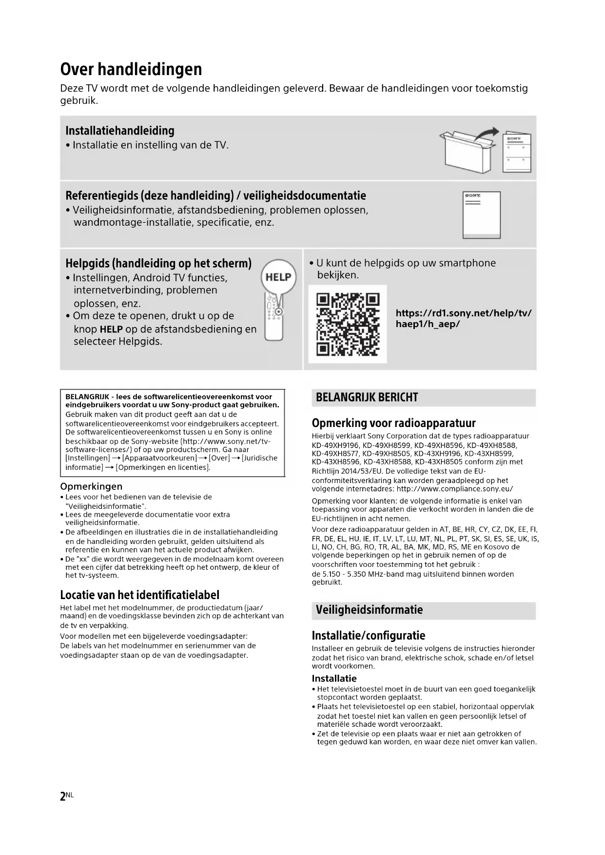 - U kunt de helpgids op uw smartphone bekijken. https://rd1.sony.net/help/tv/ haep1/h_aep/ BELANGRIJK - lees de softwarelicentieovereenkomst voor eindgebruikers voordat u uw Sony-product gaat gebruiken. Gebruik maken van dit product geeft aan dat u de softwarelicentieovereenkomst voor eindgebruikers accepteert. De softwarelicentieovereenkomst tussen u en Sony is online beschikbaar op de Sony-website (http://www.sony.net/tv- software-licenses/) of op uw productscherm. Ga naar [Instellingen] [Apparaatvoorkeuren] [Over] [Juridische informatie] [Opmerkingen en licenties]. BELANGRIJK BERICHT Veiligheidsinformatie3