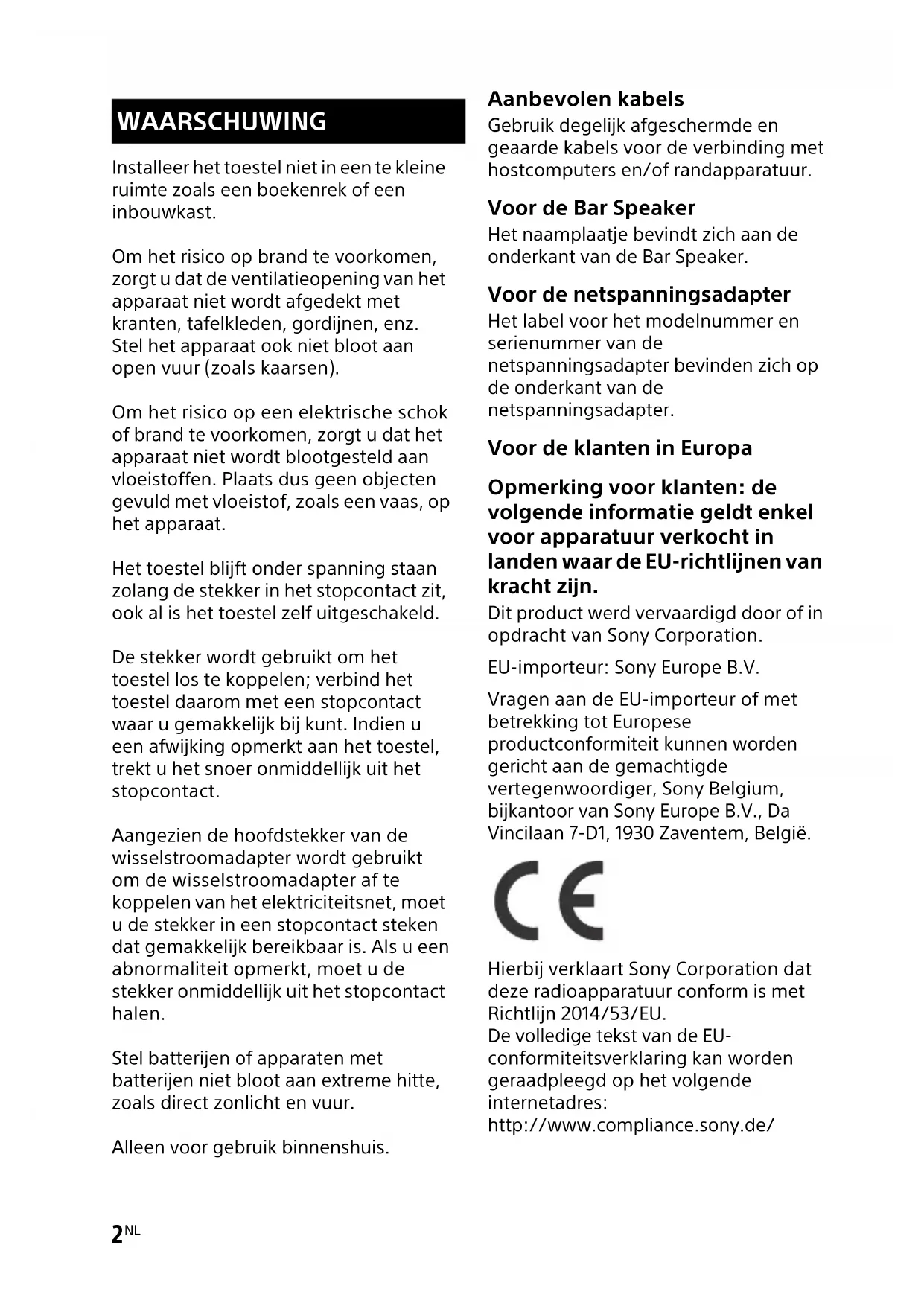Installeer het toestel niet in een te kleine ruimte zoals een boekenrek of een inbouwkast. Om het risico op brand te voorkomen, zorgt u dat de ventilatieopening van het apparaat niet wordt afgedekt met kranten, tafelkleden, gordijnen, enz. Stel het apparaat ook niet bloot aan open vuur (zoals kaarsen). Om het risico op een elektrische schok of brand te voorkomen, zorgt u dat het apparaat niet wordt blootgesteld aan vloeistoffen. Plaats dus geen objecten gevuld met vloeistof, zoals een vaas, op het apparaat. Het toestel blijft onder spanning staan zolang de stekker in het stopcontact zit, ook al is het toestel zelf uitgeschakeld. De stekker wordt gebruikt om het toestel los te koppelen; verbind het toestel daarom met een stopcontact waar u gemakkelijk bij kunt. Indien u een afwijking opmerkt aan het toestel, trekt u het snoer onmiddellijk uit het stopcontact. Aangezien de hoofdstekker van de wisselstroomadapter wordt gebruikt om de wisselstroomadapter af te koppelen van het elektriciteitsnet, moet u de stekker in een stopcontact steken dat gemakkelijk bereikbaar is. Als u een abnormaliteit opmerkt, moet u de stekker onmiddellijk uit het stopcontact halen. Stel batterijen of apparaten met batterijen niet bloot aan extreme hitte, zoals direct zonlicht en vuur. Alleen voor gebruik binnenshuis. Aanbevolen kabels Gebruik degelijk afgeschermde en geaarde kabels voor de verbinding met hostcomputers en/of randapparatuur. Voor de Bar Speaker Het naamplaatje bevindt zich aan de onderkant van de Bar Speaker. Voor de netspanningsadapter Het label voor het modelnummer en serienummer van de netspanningsadapter bevinden zich op de onderkant van de netspanningsadapter. Voor de klanten in Europa Opmerking voor klanten: de volgende informatie geldt enkel voor apparatuur verkocht in landen waar de EU-richtlijnen van kracht zijn. Dit product werd vervaardigd door of in opdracht van Sony Corporation. EU-importeur: Sony Europe B.V. Vragen aan de EU-importeur of met betrekking tot Europese productconformiteit kunnen worden gericht aan de gemachtigde vertegenwoordiger, Sony Belgium, bijkantoor van Sony Europe B.V., Da Vincilaan 7-D1, 1930 Zaventem, België. Hierbij verklaart Sony Corporation dat deze radioapparatuur conform is met Richtlijn 2014/53/EU. De volledige tekst van de EU- conformiteitsverklaring kan worden geraadpleegd op het volgende internetadres: http://www.compliance.sony.de/ WAARSCHUWING3