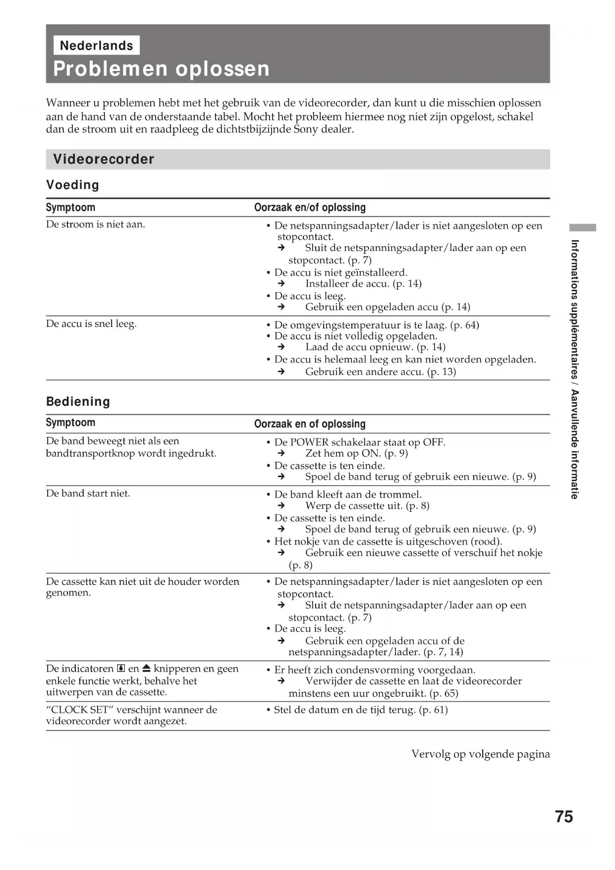 - Un dysfonctionnement du magnétoscope que vous ne pouvez pas réparer s’est produit. m Consultez votre revendeur Sony ou un centre de service après-vente Sony agréé et communiquez-leur le code à cinq caractères (exemple: E:61:10). Code à cinq caractères C:21:ππ C:22:ππ C:23:ππ C:31:ππ C:32:ππ E:61:ππ E:62:ππ Si vous ne parvenez pas à résoudre le problème, consultez votre revendeur Sony ou un centre de service après-vente Sony agréé.75 Informations supplémentaires / Aanvullende informatie Nederlands Problemen oplossen Oorzaak en/of oplossing