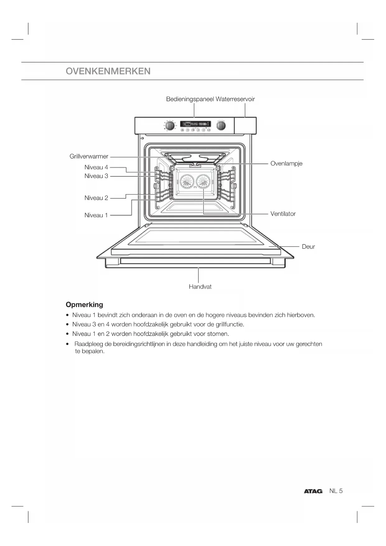 - Niveau 1 bevindt zich onderaan in de oven en de hogere niveaus bevinden zich hierboven.
