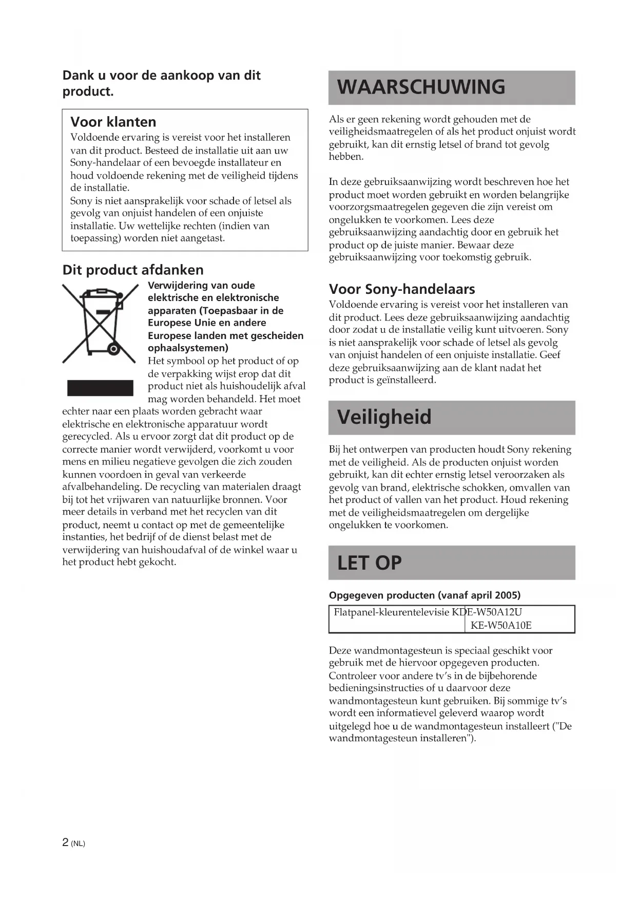 1312 (NL) WAARSCHUWING Als er geen rekening wordt gehouden met de veiligheidsmaatregelen of als het product onjuist wordt gebruikt, kan dit ernstig letsel of brand tot gevolg hebben. In deze gebruiksaanwijzing wordt beschreven hoe het product moet worden gebruikt en worden belangrijke voorzorgsmaatregelen gegeven die zijn vereist om ongelukken te voorkomen. Lees deze gebruiksaanwijzing aandachtig door en gebruik het product op de juiste manier. Bewaar deze gebruiksaanwijzing voor toekomstig gebruik. Voor Sony-handelaars Voldoende ervaring is vereist voor het installeren van dit product. Lees deze gebruiksaanwijzing aandachtig door zodat u de installatie veilig kunt uitvoeren. Sony is niet aansprakelijk voor schade of letsel als gevolg van onjuist handelen of een onjuiste installatie. Geef deze gebruiksaanwijzing aan de klant nadat het product is geïnstalleerd. Veiligheid Bij het ontwerpen van producten houdt Sony rekening met de veiligheid. Als de producten onjuist worden gebruikt, kan dit echter ernstig letsel veroorzaken als gevolg van brand, elektrische schokken, omvallen van het product of vallen van het product. Houd rekening met de veiligheidsmaatregelen om dergelijke ongelukken te voorkomen. LET OP Opgegeven producten (vanaf april 2005) Flatpanel-kleurentelevisie KDE-W50A12U KE-W50A10E Deze wandmontagesteun is speciaal geschikt voor gebruik met de hiervoor opgegeven producten. Controleer voor andere tv’s in de bijbehorende bedieningsinstructies of u daarvoor deze wandmontagesteun kunt gebruiken. Bij sommige tv’s wordt een informatievel geleverd waarop wordt uitgelegd hoe u de wandmontagesteun installeert ("De wandmontagesteun installeren"). Dank u voor de aankoop van dit product. Voor klanten Voldoende ervaring is vereist voor het installeren van dit product. Besteed de installatie uit aan uw Sony-handelaar of een bevoegde installateur en houd voldoende rekening met de veiligheid tijdens de installatie. Sony is niet aansprakelijk voor schade of letsel als gevolg van onjuist handelen of een onjuiste installatie. Uw wettelijke rechten (indien van toepassing) worden niet aangetast. Dit product afdanken Verwijdering van oude elektrische en elektronische apparaten (Toepasbaar in de Europese Unie en andere Europese landen met gescheiden ophaalsystemen) Het symbool op het product of op de verpakking wijst erop dat dit product niet als huishoudelijk afval mag worden behandeld. Het moet echter naar een plaats worden gebracht waar elektrische en elektronische apparatuur wordt gerecycled. Als u ervoor zorgt dat dit product op de correcte manier wordt verwijderd, voorkomt u voor mens en milieu negatieve gevolgen die zich zouden kunnen voordoen in geval van verkeerde afvalbehandeling. De recycling van materialen draagt bij tot het vrijwaren van natuurlijke bronnen. Voor meer details in verband met het recyclen van dit product, neemt u contact op met de gemeentelijke instanties, het bedrijf of de dienst belast met de verwijdering van huishoudafval of de winkel waar u het product hebt gekocht.3 (NL) Nederlands