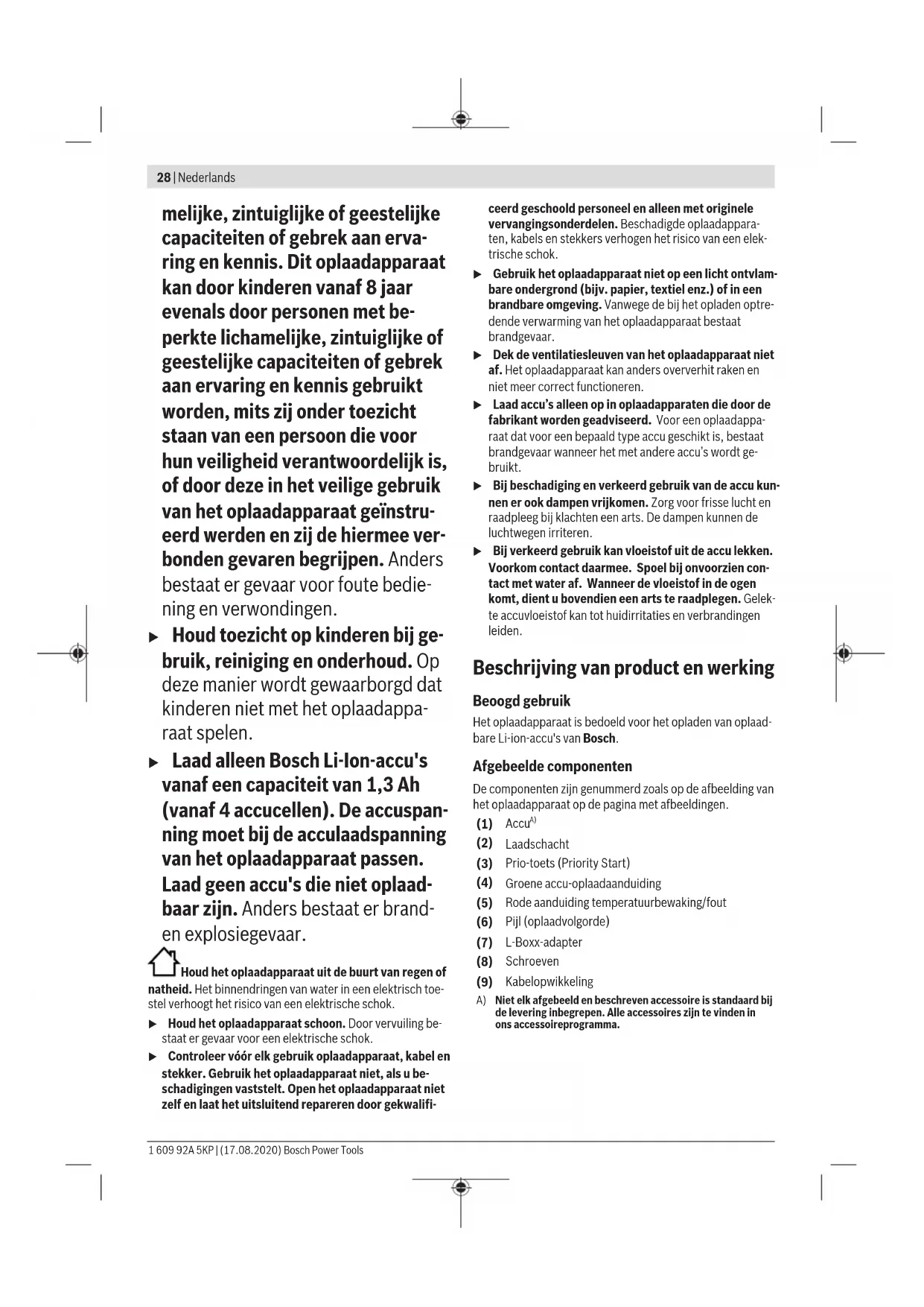 – 4,0Ah min 23 / 37 – 5,0Ah min 28 / 47 – 6,0Ah min 32 / 57 Meer oplaadtijden op www.bosch-professional.com Aantal accucellen 4–15 Gewicht volgens EPTA-Procedure01:2014 kg 1,8 Isolatieklasse / II A) afhankelijk van temperatuur en accutype B) Oplaadstand van de accu ca. 80%. De accu kan voor direct ge- bruik weggepakt worden. C) Oplaadstand van de accu 95%–100%. Gebruik Ingebruikname u Let op de netspanning! De spanning van de stroombron moet overeenkomen met de gegevens op het typeplaatje van het oplaadapparaat. Met 230V aangeduide oplaad- apparaten kunnen ook met 220V worden gebruikt. Oplaadproces De accu's (1) worden na elkaar in twee laadcycli opgeladen. – In de eerste laadcyclus worden alle geplaatste accu's tot ca.80% van de capaciteit opgeladen. – In de tweede laadcyclus worden ze van ca.80% tot ca.100% van de capaciteit opgeladen. De tweede laad- cyclus start, wanneer alle geplaatste accu's naar ca.80% zijn opgeladen. Controleren of alle laadschachten (2) en accucontacten vrij zijn van grof vuil. Controleren of alle accu's volledig ingesto- ken zijn. Het opladen begint, zodra de netstekker ingestoken en een accu geplaatst is. Wanneer het opladen met meerdere accu's gelijktijdig wordt gestart, dan worden ze na elkaar in de rich- ting van de opgedrukte pijlen (6) opgeladen (linksom). Wanneer de accu een oplaadtoestand van meer dan ca.80% heeft, wordt deze in de eerste laadcyclus overgeslagen en in de tweede laadcyclus (van ca.80% tot ca.100%) opgela- den. Wanneer tijdens de tweede laadcyclus (van ca.80% tot ca.100%) een nieuwe accu met een oplaadtoestand van minder dan ca.80% wordt geplaatst, dan wordt deze direct opgeladen. Nadat deze accu tot ca.80% is opgeladen, wordt de oplaadvolgorde opnieuw vastgelegd. De volgende accu die in de tweede laadcyclus wordt opgeladen (van ca.80% tot ca.100%), volgt de volgorde van de pijlen (6) op het oplaadapparaat (linksom). Door de intelligente oplaadmethode wordt de oplaadtoe- stand van de accu automatisch herkend en wordt de accu af- hankelijk van de accutemperatuur en -spanning met de opti- male laadstroom opgeladen. Daardoor wordt de accu ontzien en blijft deze, indien in het oplaadapparaat bewaard, altijd volledig opgeladen. Aanwijzing: Het oplaadproces is alleen mogelijk als de tem- peratuur van de accu binnen het toegestane oplaadtempera- tuurbereik ligt, zie paragraaf „Technische gegevens“. Prio-toets (Priority Start) (3) Op elke laadschacht (2) bevindt zich een Prio- toets (3) voor het direct starten van het opla- den in deze laadschacht. – Na één keer indrukken van de Prio-toets (3) wordt de accu in deze laadschacht met prioriteit tot ca.80% van zijn capaciteit opgeladen (eerste laadcy- clus). Voor het starten van het opladen lichten de eerste vier LED's van de accu-oplaadaanduiding (4) even op. Wanneer de accu tot ca.80% is opgeladen, wordt in pijl- richting (6) de volgende accu opgeladen (linksom). – Na twee keer indrukken van de Prio-toets (3) wordt de accu in deze laadschacht met prioriteit naar ca.100% opgeladen. Voor het starten van het opladen lichten de eerste vijf LED's van de accu-oplaadaanduiding (4) even op. Na beëindiging van dit oplaadproces worden de ande- re accu's verder tot ca. 80 % opgeladen. Wanneer een accu (1) helemaal met prioriteit werd opgela- den, dan wordt overgegaan naar de accu in de volgende laadschacht. De volgorde van het opladen gebeurt in de rich- ting van de opgedrukte pijlen (6) op het oplaadapparaat (linksom). Betekenis van de indicatie-elementen Groene accu-oplaadaanduiding (4) Bij het plaatsen van de accu (1) geeft de bijbehorende accu- oplaadaanduiding (4) de oplaadtoestand van de accu aan. Tijdens het opladen geven de permanent brandende LED's de opgeladen accucapaciteit aan. De na elkaar knipperende LED's (verloop) geven de capaciteit aan die net wordt opge- laden. Bosch Power Tools 1 609 92A 5KP | (17.08.2020)30 | Nederlands De LED-toestandsaanduiding geldt voor de accu (1) tijdens en na het opladen. Toestand LED Accucapaciteit, ca. De eerste LED brandt permanent. ≥20% De eerste twee LED's branden perma- nent. ≥40% De eerste drie LED's branden perma- nent. ≥60% De eerste vier LED's branden perma- nent. ≥80% De vijf LED's branden permanent. >95% Aanwijzing: Het oplaadproces is alleen mogelijk als de tem- peratuur van de accu binnen het toegestane oplaadtempera- tuurbereik ligt, zie paragraaf „Technische gegevens“. In de stand-bymodus van de laadschacht (2) brandt de eer- ste LED van de bijbehorende accu-oplaadaanduiding (4) permanent groen. Rode aanduiding temperatuurbewaking/fout (5) Permanent branden Permanent branden van de rode LED geeft aan dat de temperatuur van de accu zich buiten het toegestane oplaadtemperatuurbereik bevindt, zie deel „Technische gegevens“. Zodra het toe- gestane temperatuurbereik bereikt is, begint het oplaadpro- ces. Knipperlicht Het rode knipperlicht geeft aan dat de accu in deze laadschacht defect is. Zes gelijktijdige rode knipperlichten geven aan dat het oplaadapparaat defect is. Storingen – oorzaken en oplossingen Oorzaak Verhelpen Rode aanduiding temperatuurbewaking/fout (5) knip- pert (telkens apart op de laadschacht) Opladen niet mogelijk Accu niet (goed) geplaatst Accu correct in oplaadappa- raat plaatsen Accu- en laadcontacten vuil Accu- en laadcontacten reini- gen; bijv. door de accu her- haaldelijk te plaatsen en weg te nemen, evt. de accu ver- vangen Accu defect Accu vervangen Zes rode aanduidingen temperatuurbewaking/fout (5) knipperen tegelijkertijd Oplaadapparaat heeft een in- terne fout vastgesteld Controleren of alle accu's vol- ledig ingestoken zijn, nets- tekker uittrekken en weer in- steken. Als de fout opnieuw optreedt, het oplaadappa- raat evt. door een geautori- Oorzaak Verhelpen seerde klantendienst voor elektrische gereedschappen van Bosch laten controleren Aanduidingen branden niet Netstekker van het oplaadap- paraat is niet (of niet goed) ingestoken Netstekker (volledig) in het stopcontact steken 