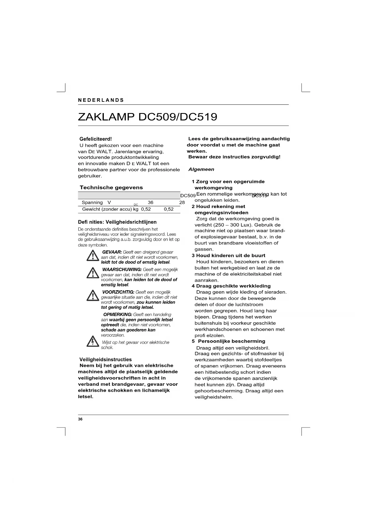 Gefeliciteerd! U heeft gekozen voor een machine van D E WALT. Jarenlange ervaring, voortdurende produktontwikkeling en innovatie maken D E WALT tot een betrouwbare partner voor de professionele gebruiker. Technische gegevens DC509 DC519 Spanning V