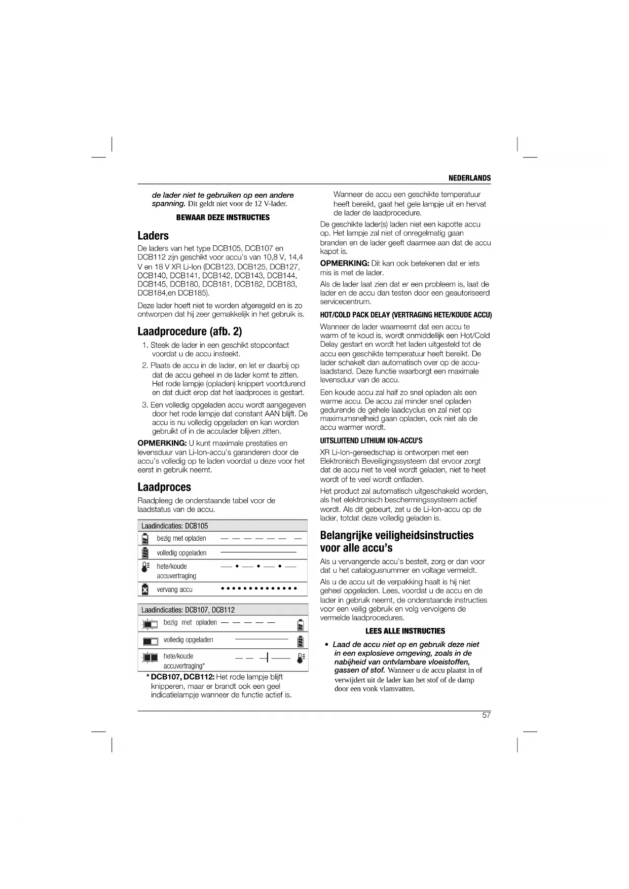 Laders De laders van het type DCB105, DCB107 en DCB112 zijn geschikt voor accu’s van 10,8V, 14,4 V en 18V XR Li-Ion (DCB123, DCB125, DCB127, DCB140, DCB141, DCB142, DCB143, DCB144, DCB145, DCB180, DCB181, DCB182, DCB183, DCB184,en DCB185). Deze lader hoeft niet te worden afgeregeld en is zo ontworpen dat hij zeer gemakkelijk in het gebruik is. Laadprocedure (afb. 2)