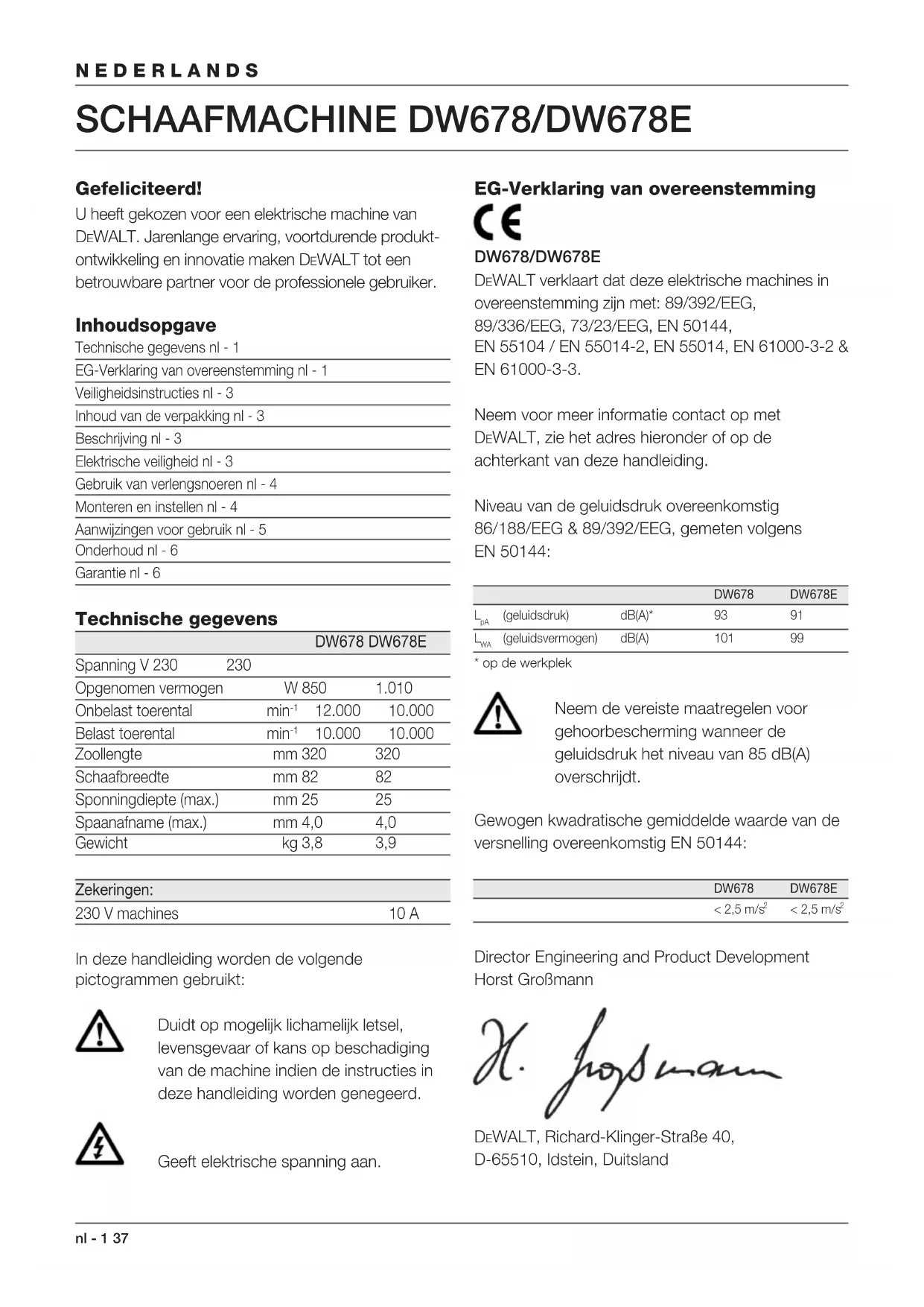 Zoollengte mm 320 320 Schaafbreedte mm 82 82 Sponningdiepte (max.) mm 25 25 Spaanafname (max.) mm 4,0 4,0 Gewicht kg 3,8 3,9 Zekeringen: 230 V machines 10 A In deze handleiding worden de volgende pictogrammen gebruikt: Duidt op mogelijk lichamelijk letsel, levensgevaar of kans op beschadiging van de machine indien de instructies in deze handleiding worden genegeerd. Geeft elektrische spanning aan. EG-Verklaring van overeenstemming DW678/DW678E DEWALT verklaart dat deze elektrische machines in overeenstemming zijn met: 89/392/EEG, 89/336/EEG, 73/23/EEG, EN 50144, EN 55104 / EN 55014-2, EN 55014, EN 61000-3-2 & EN 61000-3-3. Neem voor meer informatie contact op met DEWALT, zie het adres hieronder of op de achterkant van deze handleiding. Niveau van de geluidsdruk overeenkomstig 86/188/EEG & 89/392/EEG, gemeten volgens EN 50144: DW678 DW678E