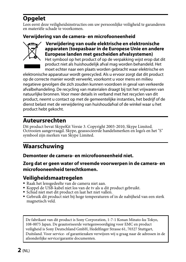 Raak het lensgedeelte van de camera niet aan. Koppel de USB-kabel niet los van de tv als u dit product gebruikt. Schud niet met dit product en laat het niet vallen. Gebruik dit product niet bij hoge temperaturen of in de nabijheid van een sterk magnetisch veld. De fabrikant van dit product is Sony Corporation, 1-7-1 Konan Minato-ku Tokyo, 108-0075 Japan. De geautoriseerde vertegenwoordiging voor EMC en product veiligheid is Sony Deutschland GmbH, Hedelfinger Strasse 61, 70327 Stuttgart, Duitsland. Voor service- of garantiezaken verwijzen wij u graag naar de adressen in de afzonderlijke service/garantie documenten. (NL)