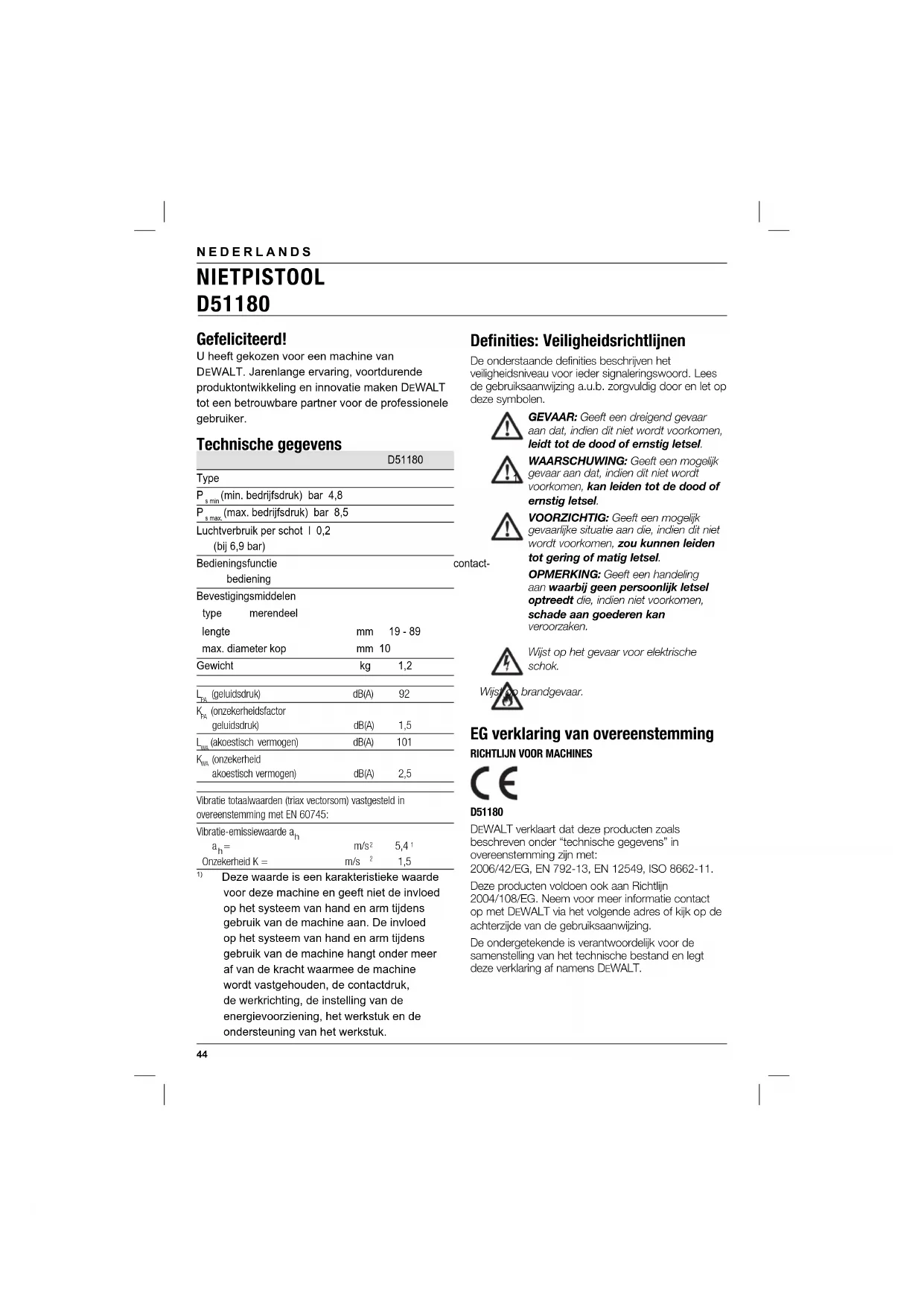 erkend D EWALT herstelagent. Dit gereedschap is in overeenstemming met de veiligheidsvoorschriften van toepassing. Om gevaar te vermijden, mag het gereedschap enkel door erkende techniekers hersteld worden. Aanvullende veiligheidsinstructies voor pneumatisch gereedschap ● Gebruik snelkoppelingen voor aansluiting op het persluchtsysteem. Monteer de niet- afsluitbare nippel op zo'n manier dat er na het ontkoppelen geen perslucht in het apparaat achter blijft. ● Gebruik altijd schone, droge perslucht. Gebruik geen zuurstof of brandbare gassen als energiebron voor dit gereedschap.46 NEDERLANDS ● Sluit het gereedschap alleen aan op een luchttoevoer waar de maximaal toelaatbare druk van het apparaat niet meer dan 10% kan worden overschreden. Wanneer de druk hoger is, moet een drukreduceerventiel inclusief een benedenveiligheidsventiel in de drukluchttoevoer worden ingebouwd. ● Gebruik alleen slangen met hogere specifi caties dan de maximum bedrijfsdruk van het apparaat. ● Ontkoppel het gereedschap van het persluchtsysteem, voor u het gereedschap gaat vervoeren, speciaal waar ladders worden gebruikt of waar een ongebruikelijke lichaamshouding wordt aangenomen tijdens het vervoer. ● Ontkoppel het gereedschap van de luchttoevoer indien niet in gebruik. Aanvullende veiligheidsinstructies voor nietpistolen ● Controleer vóór gebruik of de magneet in de nietgeleider goed werkt. Gebruik geen machine waarvan de magneet defect is. ● Draag altijd een veiligheidsbril. ● Draag altijd gehoorbescherming. ● Gebruik alleen de bevestigingsmiddelen die in deze handleiding zijn gespecifi ceerd. ● Gebruik geen bevestigingsmiddelen van gehard staal (bijv. metselwerkspijkers) of bevestigingsmiddelen die niet magnetisch zijn. ● Gebruik geen staanders om de machine op een steun te monteren. ● Gebruik het gereedschap niet als hamer. ● Richt nooit een werkend nietpistool op uzelf of een ander persoon. Verricht geen werkzaamheden waarbij het gereedschap dichtbij het lichaam moet worden gebruikt. ● Houd tijdens het werken de machine zo vast dat geen verwondingen aan hoofd of lichaam kunnen ontstaan wanneer de machine plotseling terug springt als gevolg van een onderbreking in de energietoevoer of harde vlakken in het werkstuk. ● Bedien het nietpistool nooit in de vrije ruimte. ● Probeer geen bevestigingsmiddelen te drijven in beton, steen, hardhout, knoesten of enig materiaal dat zo hard is dat de bevestigingsmiddelen er niet in kunnen doordringen. ● Maak uzelf vertrouwd in het werkgebied. Bevestigingsmiddelen kunnen dunne werkstukken doorboren of kunnen van de hoeken en randen van het werkstuk wegglijden, en op deze manier mensen in gevaar brengen. ● Schiet geen bevestigingsmiddelen dicht bij de rand van een werkstuk. ● Schiet geen bevestigingsmiddelen boven op andere bevestigingsmiddelen. ● Controleer voordat u het gereedschap neerlegt, altijd of er geen bevestigingsmiddel in de nietgeleider zit. WAARSCHUWING! Het gebruik van dit gereedschap kan stof opwekken en/of afgeven, hetgeen ernstige en permanente ademhalingsproblemen of ander letsel kan veroorzaken. Draag afdoende persoonlijke veiligheidsuitrusting. Overige risico’s