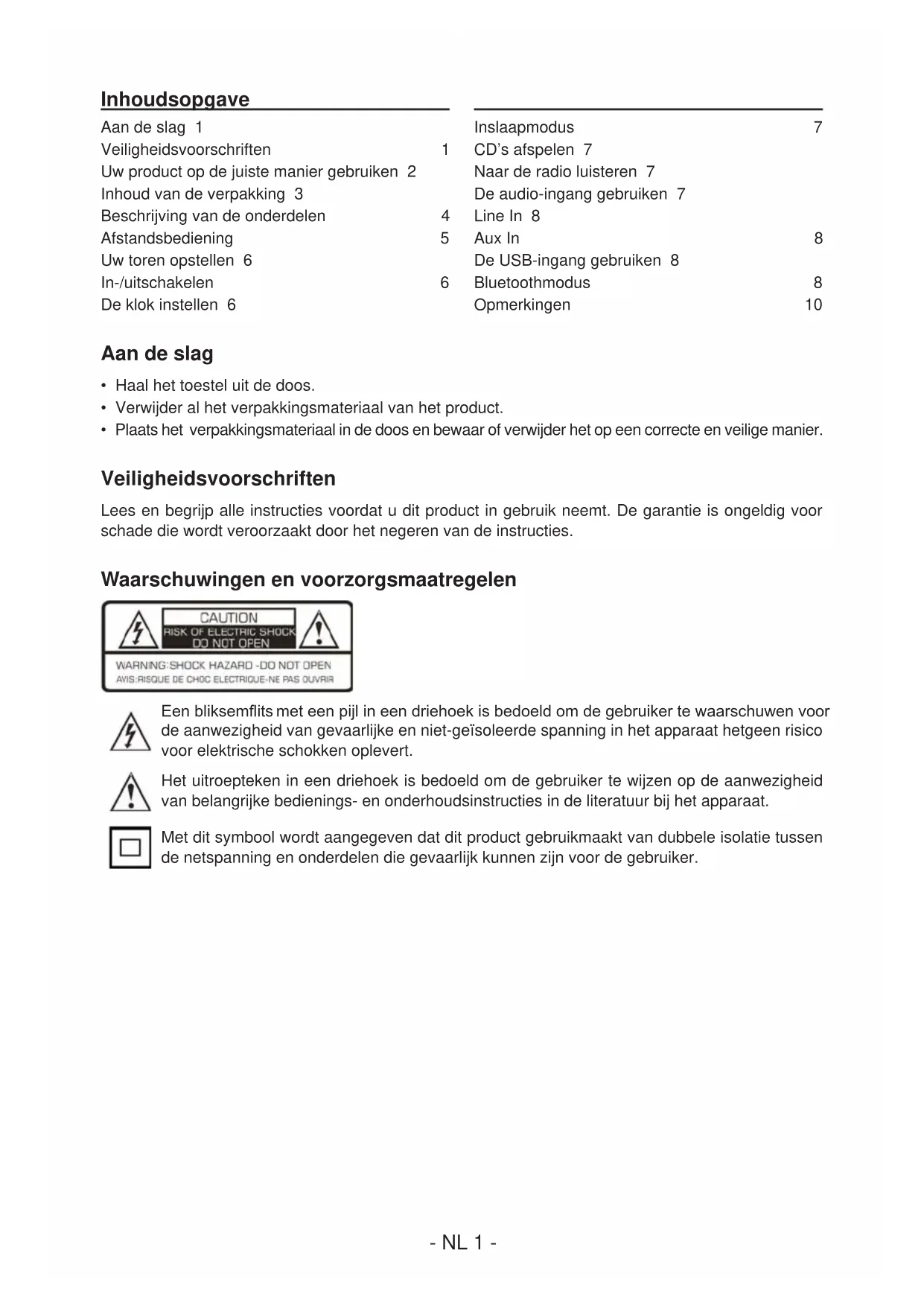 - Plaats het verpakkingsmateriaal in de doos en bewaar of verwijder het op een correcte en veilige manier. Veiligheidsvoorschriften Lees en begrijp alle instructies voordat u dit product in gebruik neemt. De garantie is ongeldig voor schade die wordt veroorzaakt door het negeren van de instructies.