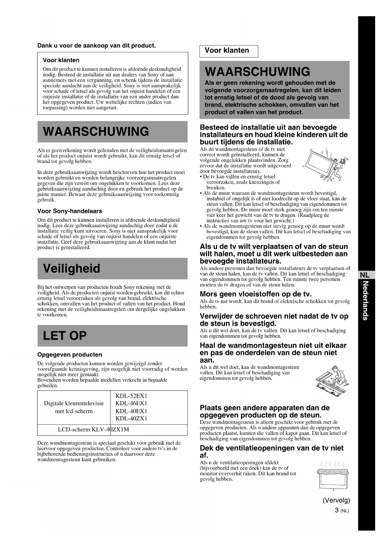 - Als de wandmontagesteun niet stevig genoeg op de muur wordt bevestigd, kan de steun vallen. Dit kan letsel of beschadiging van eigendommen tot gevolg hebben. Als u de tv wilt verplaatsen of van de steun wilt halen, moet u dit werk uitbesteden aan bevoegde installateurs. Als andere personen dan bevoegde installateurs de tv verplaatsen of van de steun halen, kan de tv vallen. Dit kan letsel of beschadiging van eigendommen tot gevolg hebben. Ten minste twee personen moeten de tv dragen of van de steun halen. Mors geen vloeistoffen op de tv. Als de tv nat wordt, kan dit brand of elektrische schokken tot gevolg hebben. Verwijder de schroeven niet nadat de tv op de steun is bevestigd. Als u dit wel doet, kan de tv vallen. Dit kan letsel of beschadiging van eigendommen tot gevolg hebben. Haal de wandmontagesteun niet uit elkaar en pas de onderdelen van de steun niet aan. Als u dit wel doet, kan de wandmontagesteun vallen. Dit kan letsel of beschadiging van eigendommen tot gevolg hebben. Plaats geen andere apparaten dan de opgegeven producten op de steun. Deze wandmontagesteun is alleen geschikt voor gebruik met de opgegeven producten. Als u andere apparaten dan de opgegeven producten plaatst, kunnen die vallen of kapot gaan. Dit kan letsel of beschadiging van eigendommen tot gevolg hebben. Dek de ventilatieopeningen van de tv niet af. Als u de ventilatieopeningen afdekt (bijvoorbeeld met een doek) kan de tv of monitor oververhit raken. Dit kan brand tot gevolg hebben. Voor klanten Om dit product te kunnen installeren is afdoende deskundigheid nodig. Besteed de installatie uit aan dealers van Sony of aan aannemers met een vergunning, en schenk tijdens de installatie speciale aandacht aan de veiligheid. Sony is niet aansprakelijk voor schade of letsel als gevolg van het onjuist handelen of een onjuiste installatie of de installatie van een ander product dan het opgegeven product. Uw wettelijke rechten (indien van toepassing) worden niet aangetast. WAARSCHUWING Veiligheid LET OP Digitale kleurentelevisie met lcd-scherm KDL-52EX1 KDL-46EX1 KDL-40EX1 KDL-40ZX1 LCD-scherm KLV-40ZX1M WAARSCHUWING Als er geen rekening wordt gehouden met de volgende voorzorgsmaatregelen, kan dit leiden tot ernstig letsel of de dood als gevolg van brand, elektrische schokken, omvallen van het product of vallen van het product. Voor klanten