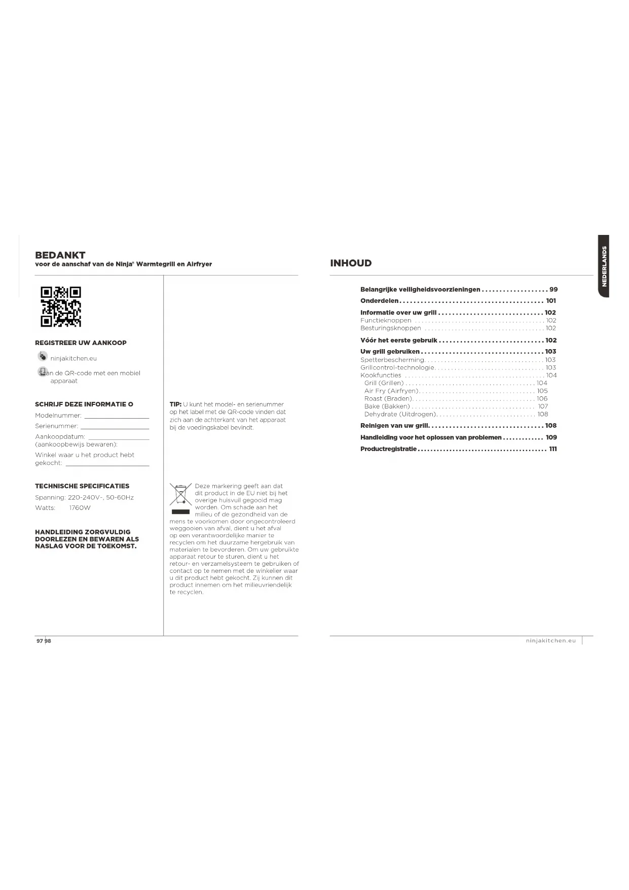 - ninjakitchen.eu Scan de QR-code met een mobiel apparaat Deze markering geeft aan dat dit product in de EU niet bij het overige huisvuil gegooid mag worden. Om schade aan het milieu of de gezondheid van de mens te voorkomen door ongecontroleerd weggooien van afval, dient u het afval op een verantwoordelijke manier te recyclen om het duurzame hergebruik van materialen te bevorderen. Om uw gebruikte apparaat retour te sturen, dient u het retour- en verzamelsysteem te gebruiken of contact op te nemen met de winkelier waar u dit product hebt gekocht. Zij kunnen dit product innemen om het milieuvriendelijk te recyclen. Belangrijke veiligheidsvoorzieningen p. 99