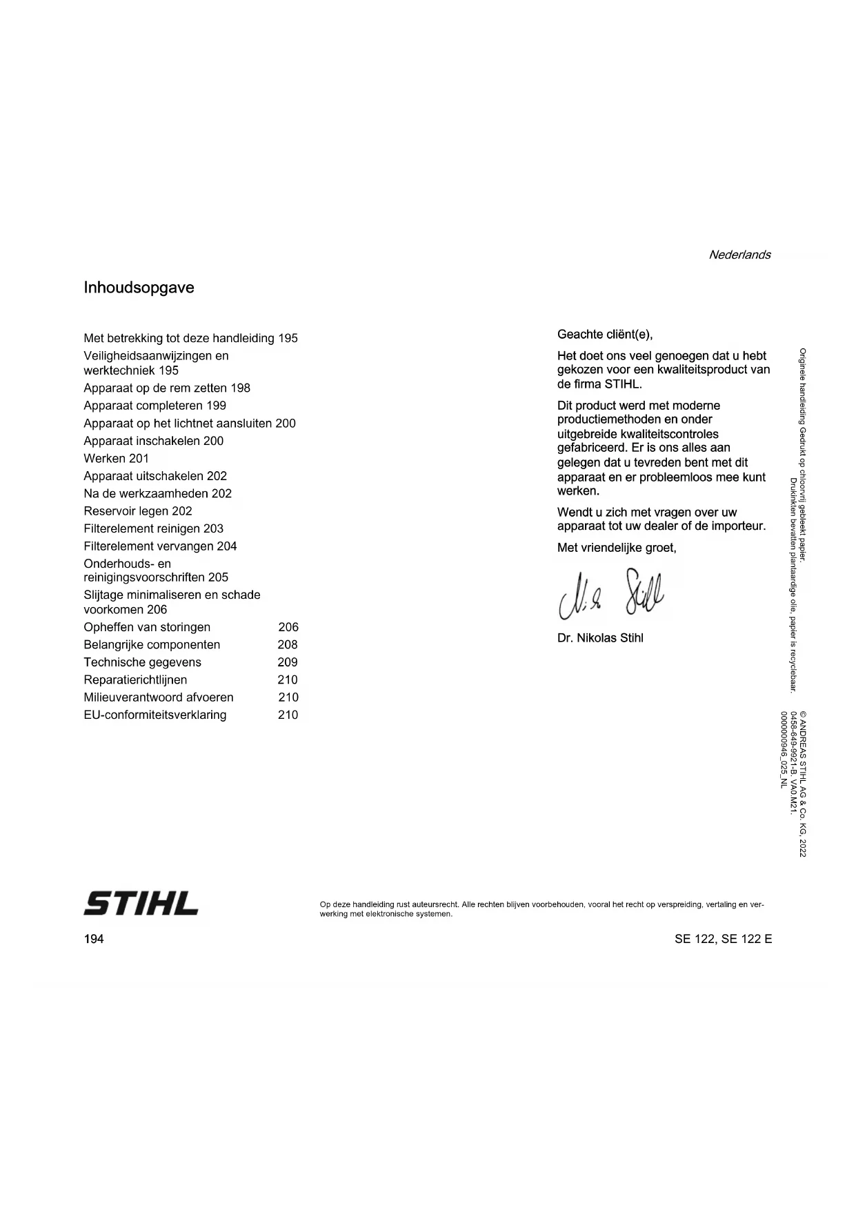 Op deze handleiding rust auteursrecht. Alle rechten blijven voorbehouden, vooral het recht op verspreiding, vertaling en ver- werking met elektronische systemen. Inhoudsopgave Geachte cliënt(e), Het doet ons veel genoegen dat u hebt gekozen voor een kwaliteitsproduct van de firma STIHL. Dit product werd met moderne productiemethoden en onder uitgebreide kwaliteitscontroles gefabriceerd. Er is ons alles aan gelegen dat u tevreden bent met dit apparaat en er probleemloos mee kunt werken. Wendt u zich met vragen over uw apparaat tot uw dealer of de importeur. Met vriendelijke groet, Dr. Nikolas Stihl Met betrekking tot deze handleiding 195 Veiligheidsaanwijzingen en werktechniek 195 Apparaat op de rem zetten 198 Apparaat completeren 199 Apparaat op het lichtnet aansluiten 200 Apparaat inschakelen 200 Werken 201 Apparaat uitschakelen 202 Na de werkzaamheden 202 Reservoir legen 202 Filterelement reinigen 203 Filterelement vervangen 204 Onderhouds- en reinigingsvoorschriften 205 Slijtage minimaliseren en schade voorkomen 206 Opheffen van storingen 206 Belangrijke componenten 208 Technische gegevens 209 Reparatierichtlijnen 210 Milieuverantwoord afvoeren 210 EU-conformiteitsverklaring 210SE 122, SE 122 E Nederlands