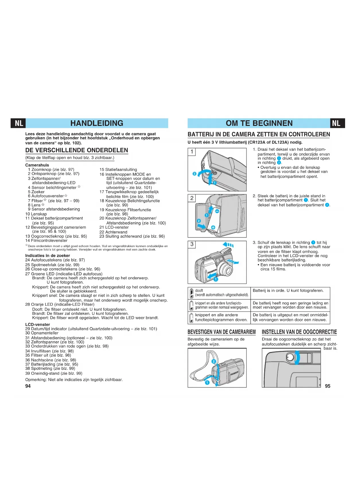 Draai de oogcorrectieknop zo dat het autofocusteken duidelijk en scherp zicht- baar is. De batterij is uitgeput en moet onmiddel- lijk vervangen worden door een nieuwe.FOTOGRAFEREN STANDAARD FUNCTIES
