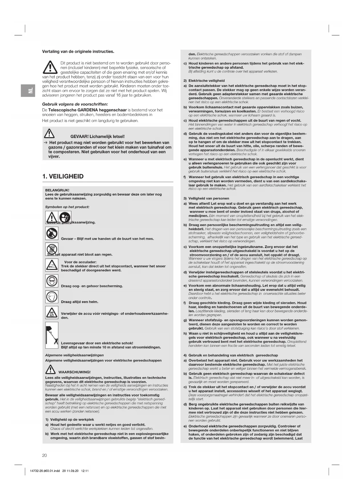 Vertaling van de originele instructies. Dit product is niet bestemd om te worden gebruikt door perso- nen (inclusief kinderen) met beperkte fysieke, sensorische of geestelijke capaciteiten of die geen ervaring met en/of kennis van het product hebben, tenzij zij onder toezicht staan van een voor hun veiligheid verantwoordelijke persoon of hiervan instructies hebben gekre- gen hoe het product moet worden gebruikt. Kinderen moeten onder toe- zicht staan om ervoor te zorgen dat ze niet met het product spelen. Wij adviseren jongeren het product pas vanaf 16 jaar te gebruiken. Gebruik volgens de voorschriften: De Telescopische GARDENA heggenschaar is bestemd voor het snoeien van heggen, struiken, heesters en bodembedekkers in Het product is niet geschikt om langdurig te gebruiken. GEVAAR! Lichamelijk letsel! v Het product mag niet worden gebruikt voor het bewerken van gazons / gazonranden of voor het klein maken van tuinafval om te composteren. Niet gebruiken voor het onderhoud van een vijver. 14732-20.960.01.indd 20 11.09.20 12:11NL