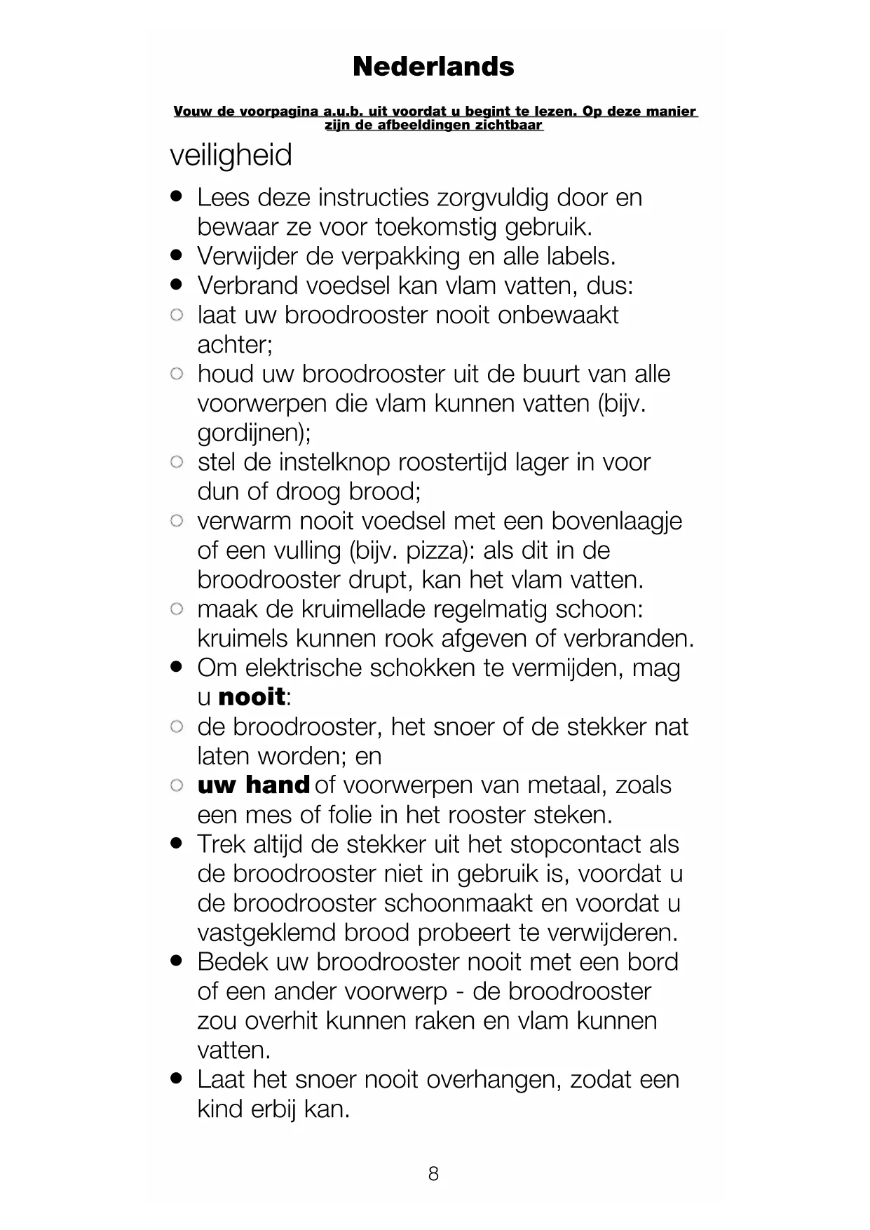 verwarm nooit voedsel met een bovenlaagje of een vulling (bijv. pizza): als dit in de broodrooster drupt, kan het vlam vatten.