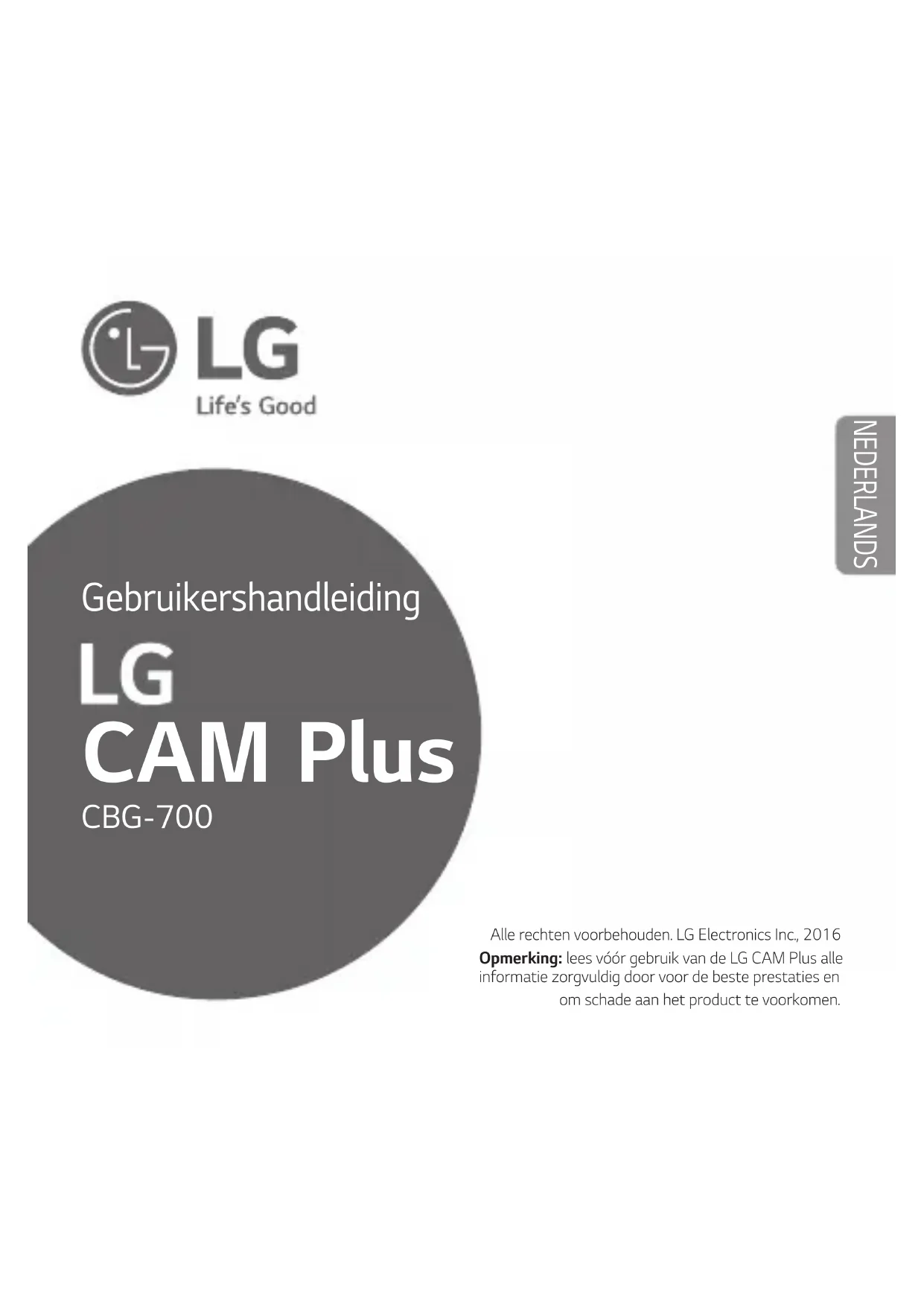 - Reeksopnamen U kunt reeksopnamen maken om bewegende foto’s te maken. Houd op het automatische-modusscherm ingedrukt of houd de sluiterknop op de LG CAM Plus ingedrukt. Reeksopnamen worden bij een hoge snelheid genomen terwijl of de sluiterknop ingedrukt wordt gehouden.13 USB-type USB 2.0 (type C) Batterij Li-ion 1200 mAh Oplaadtijd Minder dan 200 minuten Spanning 5 V ±10%, 9 V ±10% Stroomverbruik 25 mA (zonder opladen), 1 mA (uitgeschakeld) Oplaadverbruik 500 mA Uitgangsverbruik 500 mA Audio Luidspreker en digitale microfoon Geluidsniveau 1 m geluidsniveau 60 dB ↑ (100%) *gebaseerd op volledig opladen Antenne GSM/CDMA, WCDMA, LTE LED Batterij-indicator Bedrijfstemperatuur -20 °C ~ 40 °C Afmetingen/gewicht 73,9 x 61,4 x 15,9 mm / 55,4 g Specicatiesenfuncties14 Verwijdering van uw oude apparaat 1 Dit symbool van de doorgekruiste vuilnisbak geeft aan dat afgedankte elektrische en elektronische producten (WEEE) afzonderlijk van het huishoudelijke afval moeten worden verwijderd. 2 Oude elektrische producten kunnen gevaarlijke stoffen bevatten, dus een juiste verwijdering van uw oude apparaat helpt bij het voorkomen van mogelijke negatieve gevolgen voor het milieu en de volksgezondheid. Uw oude apparaat kan herbruikbare onderdelen bevatten die gebruikt zouden kunnen worden voor het repareren van andere producten, en andere waardevolle materialen die kunnen worden gerecycleerd voor het behoud van beperkte grondstoffen. 3 U kunt uw apparaat meenemen naar de winkel waar u het product hebt gekocht, of u kunt contact opnemen met uw plaatselijke afvalinstantie voor de gegevens van uw dichtstbijzijnde geautoriseerde WEEE-verzamelpunt. Voor de meest geactualiseerde informatie voor uw land wordt verwezen naar www. lg.com/global/recycling Aanvullende informatie15 Batterijen wegdoen 1 Dit symbool kan worden gebruikt in combinatie met chemische symbolen voor kwik (Hg), cadmium (Cd) of lood (Pb) als de accu meer dan 0,0005% kwik, 0,002% cadmium of 0,004% lood bevat. 2 Alle batterijen/accu’s mogen niet worden meegegeven met het huishoudelijk afval, maar moeten worden ingeleverd bij speciale inzamelingspunten die door de lokale of landelijke overheid zijn aangewezen. 3 De correcte verwijdering van uw oude batterijen/accu’s helpt negatieve gevolgen voor het milieu en de gezondheid van mens en dier voorkomen. 4 Wilt u meer informatie over de verwijdering van uw oude batterijen/accu’s? Neem dan contact op met de plaatselijke autoriteiten, de afvalophaaldienst of de winkel waar u het product hebt gekocht.16 ONDER VOORBEHOUD VAN DE VOORWAARDEN VAN DEZE BEPERKTE GARANTIE GARANDEERT LG ELECTRONICS DAT DIT PRODUCT VRIJ IS VAN ONTWERP-, MATERIAAL- EN FABRICAGEFOUTEN OP HET MOMENT VAN DE OORSPRONKELIJKE AANKOOP DOOR EEN CONSUMENT, EN VOOR EEN DAAROPVOLGENDE PERIODE VAN ÉÉN (1) JAAR. MOCHT ER GARANTIESERVICE VOOR UW PRODUCT NODIG ZIJN, RETOURNEER HET PRODUCT DAN AAN DE DEALER WAAR HET PRODUCT IS AANGESCHAFT OF NEEM CONTACT OP MET HET PLAATSELIJKE CONTACTCENTRUM VAN LG ELECTRONICS VOOR MEER INFORMATIE. Beperkte garantieWszelkie prawa zastrzeżone. LG Electronics Inc., 2016 Uwaga: przed rozpoczęciem korzystania z urządzenia LG CAM Plus należy dokładnie zapoznać się ze wszystkimi informacjami, co pozwoli uniknąć uszkodzenia produktu i najlepiej wykorzystać jego możliwości. POLSKI Instrukcja obsługi CAM Plus CBG-7002 CAM Plus to nakładka na aparat i zarazem obudowa dodatkowej baterii. Można ją założyć na tył urządzenia G5.