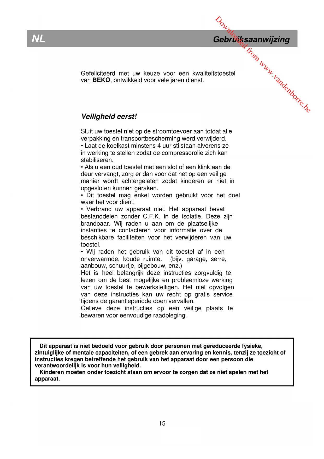 Dit apparaat is niet bedoeld voor gebruik door personen met gereduceerde fysieke, zintuiglijke of mentale capaciteiten, of een gebrek aan ervaring en kennis, tenzij ze toezicht of instructies kregen betreffende het gebruik van het apparaat door een persoon die verantwoordelijk is voor hun veiligheid. Kinderen moeten onder toezicht staan om ervoor te zorgen dat ze niet spelen met het apparaat. Downloaded from www.vandenborre.beNL Gebruiksaanwijzing Elektriciteitsvereisten Vergewis u ervan, alvorens u de stekker in het stopcontact steekt, dat de voltage en de frequentie op de kwalificatieplaat binnenin het toestel overeenkomen met uw stroomtoevoer. Wij raden u aan dit toestel aan te sluiten op de hoofdtoevoer via een naar behoren aangesloten en verzekerd stopcontact op een onmiddellijk bereikbare plaats. Waarschuwing! Dit toestel moet worden geaard. Herstellingen aan de elektrische uitrusting mogen enkel door een gekwalificeerde technicus worden uitgevoerd. Foutieve herstellingen, die werden uitgevoerd door een ongekwalificeerde persoon, houden risico’s in die kritieke gevolgen kunnen hebben voor de gebruiker van het toestel. OPGELET! Dit toestel werkt op R 600a. Dit is een milieuvriendelijk, maar brandbaar gas. Tijdens het transport en de plaatsing van het product moet er zorg voor worden gedragen dat het koelsysteem niet wordt beschadigd. Als het koelsysteem toch wordt beschadigd en er ontstaat een gaslek, houd het product dan verwijderd van ontstekingsbronnen en verlucht de kamer een tijdje. WAARSCHUWING - Gebruik geen mechanische apparaten of andere middelen om het ontdooiingproces te versnellen dan die apparatuur of middelen die door de fabrikant worden aangeraden. WAARSCHUWING - Beschadig het koelcircuit niet. WAARSCHUWING - Gebruik geen elektrische toestellen in de bewaarladen van het toestel, tenzij ze door de fabrikant worden aangeraden. WAARSCHUWING - Indien het netsnoer beschadigd is, moet dit door de producent, de dealer of een ander gekwalificeerd persoon worden gerepareerd om gevaar te voorkomen. Transportinstructies