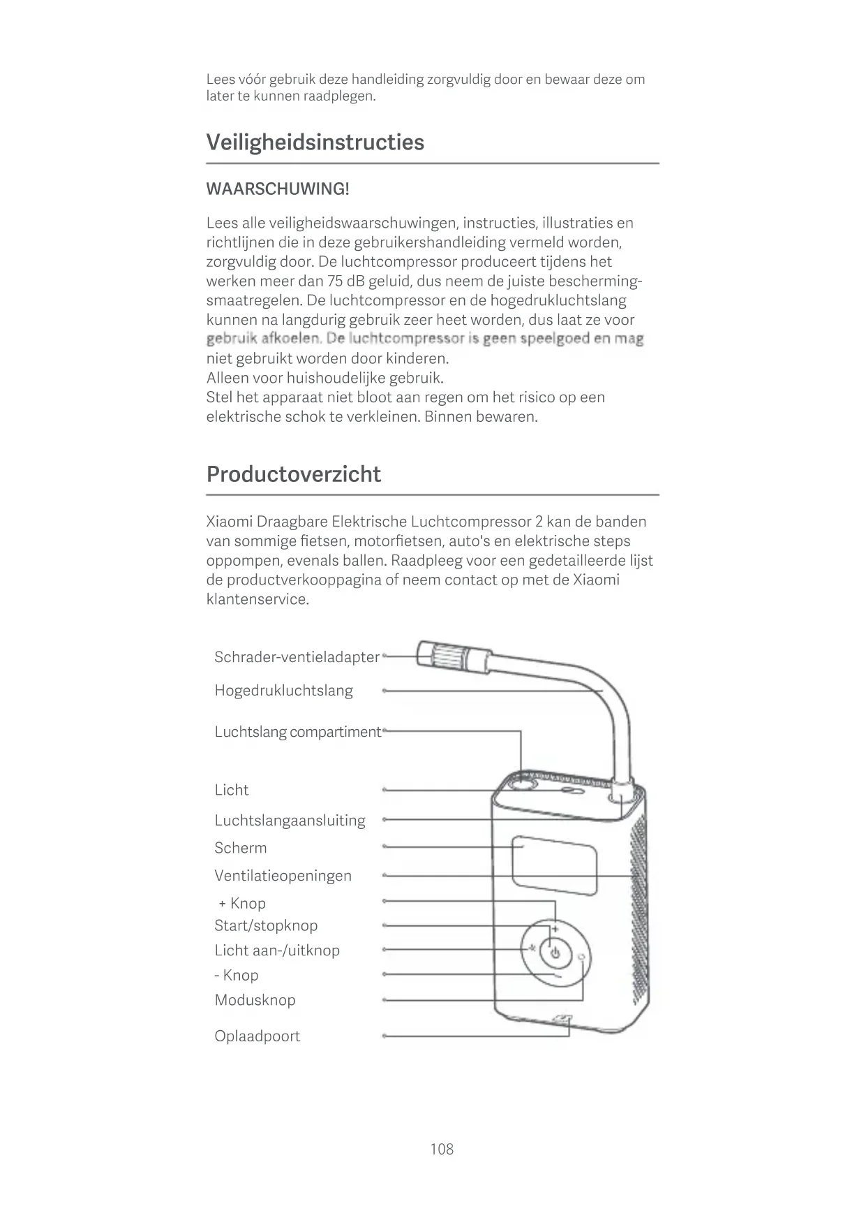 이 기호가 표시된 모든 제품은 전자폐기물에 포함(WEEE, 2012/19/EU 지침에 의거)됨으로 분류되지 않은 가정 폐기물과 혼합하여 폐기해서는 안 됩니다. 대신 정부나 로컬 자치단체가 전자 폐기물의 재활용을 위해 지정한 수거 지점에 넘겨 사람의 건강과 환경을 보호해야 합니다. 올바른 처리와 재활용은 환경과 인간의 건강에 대한 잠재적인 부정적 결과를 예방하는 데 도움이 될 것입니다. 해당 수집 지점의 약관 및 위치에 대한 자세한 내용은 설치자 또는 로컬 자치단체에 문의하십시오. 의뢰업체: Xiaomi Communications Co., Ltd. 제조업체: Shanghai HOTO Technology Co., Ltd. (Mi 생태계 기업) 주소: Building 45, No. 50 Moganshan Road, Shanghai, China 제품 관련 정보는 www.mi.com/kr/를 방문해 주시기 바랍니다. 사용 설명서 버전: V1.0 107Veiligheidsinstructies WAARSCHUWING! Lees alle veiligheidswaarschuwingen, instructies, illustraties en richtlijnen die in deze gebruikershandleiding vermeld worden, zorgvuldig door. De luchtcompressor produceert tijdens het werken meer dan 75 dB geluid, dus neem de juiste bescherming- smaatregelen. De luchtcompressor en de hogedrukluchtslang kunnen na langdurig gebruik zeer heet worden, dus laat ze voor niet gebruikt worden door kinderen. Alleen voor huishoudelijke gebruik. Stel het apparaat niet bloot aan regen om het risico op een elektrische schok te verkleinen. Binnen bewaren. Productoverzicht Xiaomi Draagbare Elektrische Luchtcompressor 2 kan de banden van sommige fietsen, motorfietsen, auto's en elektrische steps oppompen, evenals ballen. Raadpleeg voor een gedetailleerde lijst de productverkooppagina of neem contact op met de Xiaomi klantenservice. Hogedrukluchtslang Licht Schrader-ventieladapter + Knop Start/stopknop Licht aan-/uitknop - Knop Modusknop Oplaadpoort Ventilatieopeningen Luchtslangaansluiting Luchtslang compartiment Scherm Lees vóór gebruik deze handleiding zorgvuldig door en bewaar deze om later te kunnen raadplegen. 108Hoe te gebruiken Opladen Laad de luchtcompressor volledig op als u deze voor de eerste keer gebruikt. Sluit de oplaadkabel aan op een compatibele 5 V USB-voedingsadapter om de luchtcompressor op te laden. Opmerking: De opberghoes bevat een binnenzak waarin de Presta-ventieladapter, de naaldventieladapter en de snelkoppelingsventieladapter kunnen worden opgeborgen. Oplaadstatus: Opmerkingen: