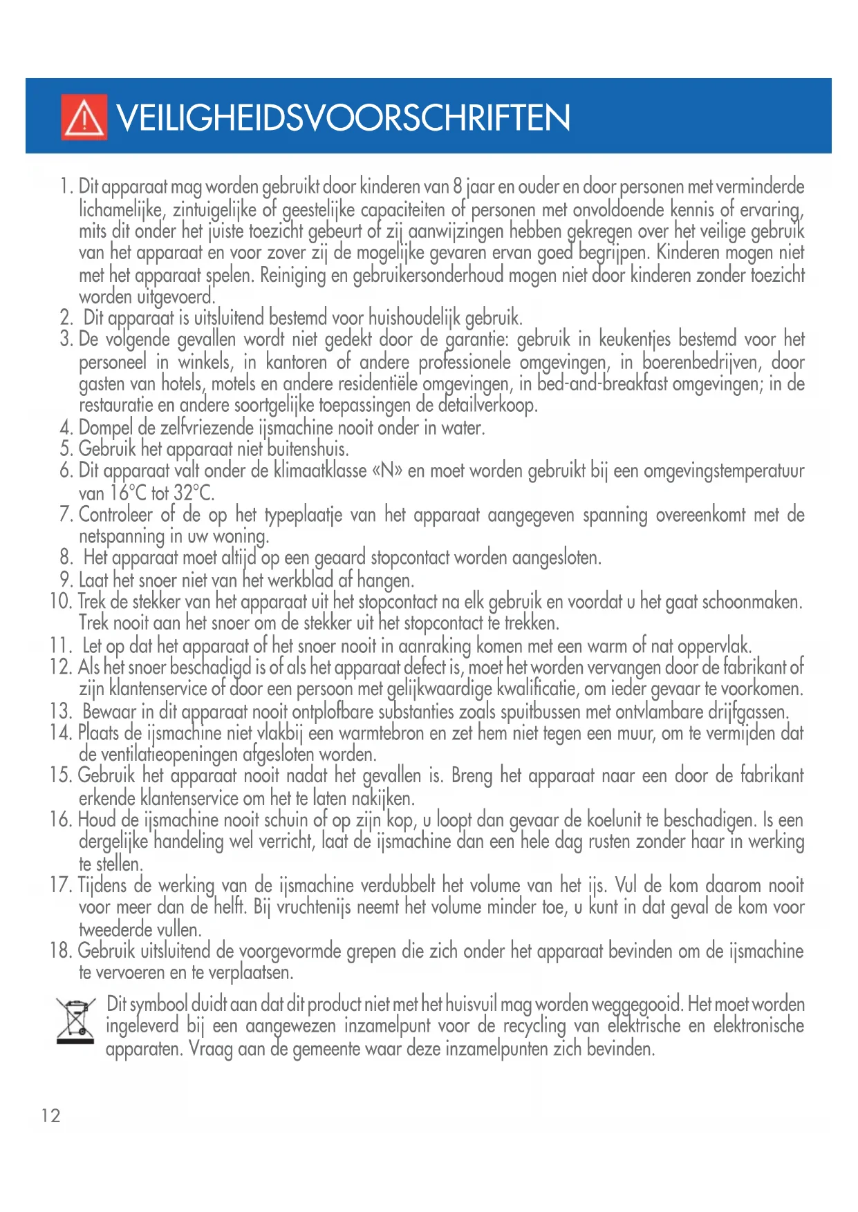 12. Als het snoer beschadigd is of als het apparaat defect is, moet het worden vervangen door de fabrikant of