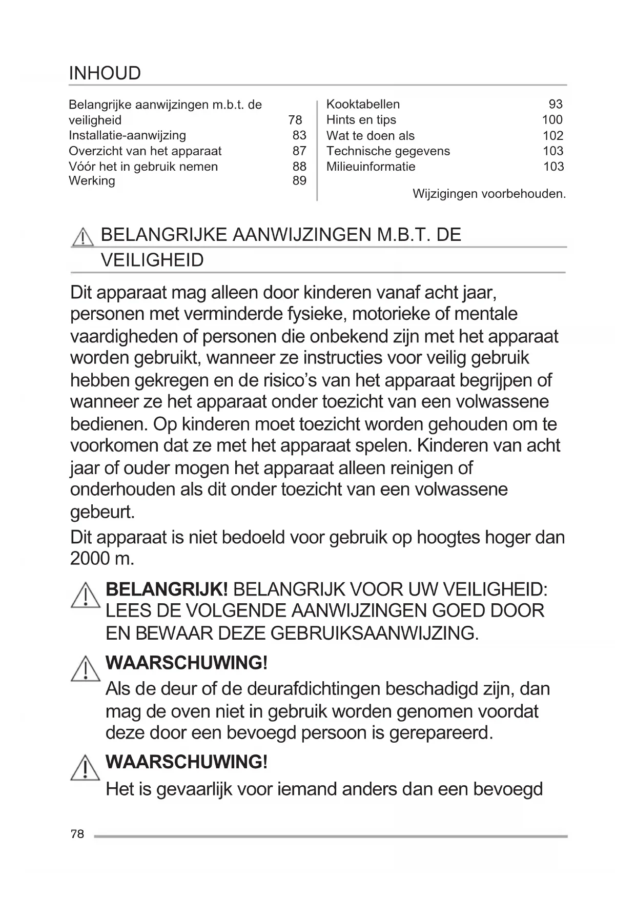 Plateau tournant ø 272 mm, verre Poids env. 16 kg INFORMATIONS ENVIRONNEMENTALES 3_Zanker_French_CS_BASE_Z16UICTO_Layout 1 15/06/2020 10:17 Page 7778 dit apparaat mag alleen door kinderen vanaf acht jaar, personen met verminderde fysieke, motorieke of mentale vaardigheden of personen die onbekend zijn met het apparaat worden gebruikt, wanneer ze instructies voor veilig gebruik hebben gekregen en de risico’s van het apparaat begrijpen of wanneer ze het apparaat onder toezicht van een volwassene bedienen. Op kinderen moet toezicht worden gehouden om te voorkomen dat ze met het apparaat spelen. Kinderen van acht jaar of ouder mogen het apparaat alleen reinigen of onderhouden als dit onder toezicht van een volwassene gebeurt. dit apparaat is niet bedoeld voor gebruik op hoogtes hoger dan 2000 m. BELANGRIJK! BelangrIjK VOOr UW VeIlIgHeId: leeS de VOlgende aanWIjzIngen gOed dOOr en B eWaar deze geBrUIKSaanWIjzIng. WAARSCHUWING! als de deur of de deurafdichtingen beschadigd zijn, dan mag de oven niet in gebruik worden genomen voordat deze door een bevoegd persoon is gerepareerd. WAARSCHUWING! Het is gevaarlijk voor iemand anders dan een bevoegd InHOUd BelangrIjKe aanWIjzIngen M.B.T. de VeIlIgHeId Belangrijke aanwijzingen m.b.t. de veiligheid 78 Installatie-aanwijzing 83 Overzicht van het apparaat 87 Vóór het in gebruik nemen 88 Werking 89 Kooktabellen 93 Hints en tips 100 Wat te doen als 102 Technische gegevens 103 Milieuinformatie 103 Wijzigingen voorbehouden. 4_ZANKER_Dutch_CS_BASE_Z16UICTO_Layout 1 15/06/2020 10:26 Page 7879 persoon om onderhouds- of reparatiewerkzaamheden uit te voeren waarbij een afdekking moet worden verwijderd die bescherming biedt tegen blootstelling aan microgolfenergie. WAARSCHUWING! levensmiddelen in vloeibare en andere vorm mogen niet in afgesloten bakjes verwarmd worden; ze zouden kunnen exploderen. dit apparaat is alleen bedoeld voor huishoudelijke en vergelijkbare toepassingen, zoals: keukens voor personeel in winkels, kantoor en andere werkplekken; woonboerderijen; door gasten van hotels, motels en andere overnachtingsaccommodaties; omgevingen zoals bed-and- breakfasts. alleen voor magnetrons geschikt servies gebruiken. Metalen houders voor eten of drinken zijn niet toegestaan in de magnetron. Het apparaat nooit zonder toezicht laten, als u verpakkingen van kunststof, papier of ander brandbaar materiaal gebruikt. de magnetronoven is bedoeld voor het verwarmen van voedsel en drank. Het drogen van voedsel of kleding en het verwarmen van warmtekussens, pantoffels, sponzen en vochtige doeken en dergelijke kan leiden tot kans op letsel, ontvlamming of brand. nOOIT de deUr OPenen, als in het apparaat verwarmde levensmi ddelen beginnen te roken. Het apparaat uitschakelen, de stekker uit het stopcontact trekken en wachten tot de levensmiddelen niet meer roken. als u de deur opent tijdens de rookontwikkeling kan dat brand veroorzaken. Wees bij het verwarmen van vloeistoffen in de magnetron voorzichtig als u het kopje of de beker uit de oven neemt; het kan tot kookpuntvert-raging komen en de vloeistof kan 4_ZANKER_Dutch_CS_BASE_Z16UICTO_Layout 1 15/06/2020 10:26 Page 7980 plotseling hevig overkoken of spatten. Om verbrandingen te voorkomen, dient de inhoud van zuigflessen en glazen potten met babyvoeding omgeroerd of geschud worden en de temperatuur gecontroleerd te worden, voordat u uw baby de voeding geeft. eieren niet in de dop koken. Hardgekookte eieren mogen niet in de magnetron verwarmd worden, omdat ze zelfs na het verwarmen kunnen exploderen. Reiniging & onderhoud apparaatdeur: de deur, de deurafdichting en de afsluitvlakken regelmatig met een vochtige doek afnemen om verontreinigingen te verwijderen. gebruik geen agressieve schuurmiddelen of scherpe metalen schrapers om de ruit van de ovendeur te reinigen aangezien hierdoor krassen op het oppervlak kunnen ontstaan waardoor de ruit kan breken. Ovenruimte: na elk gebruik het nog warme apparaat met een zachte, vochtige doek of spons afnemen, om lichte verontreinigingen te verwijderen. Voor sterke verontreinigingen een mild sopje gebruiken en verschillende keren met een zachte, vochtige doek of spons grondig afnemen, tot alle resten volledig verwijderd zijn. Verwijder nooit de afdekking van de microgolvengeleider. let erop dat er geen zeepsop of water door de kleine openingen in de wand dringt, omdat het apparaat daardoor beschadigd kan raken. gebruik geen reinigingsspray in de ovenruimte. de afdekking van de microgolvengeleider, de ovenruimte, het draaiplateau en het draaimechanisme na gebruik van het apparaat reinigen. deze onderdelen moeten droog en vetvrij zijn. achterblijvende vetspatten kunnen oververhit raken, gaan roken of ontbranden. 4_ZANKER_Dutch_CS_BASE_Z16UICTO_Layout 1 15/06/2020 10:26 Page 8081 Ommanteling: de buitenkant van het apparaat met een mild sopje schoonmaken. goed met een droge doek afnemen en met een handdoek nadrogen. Bedieningspaneel: Voor het reinigen de deur openen om het bedieningspaneel te deactiveren. Het paneel voorzichtig met een vochtige doek schoonmaken. nooit te veel water en geen chemische of schurende reinigingsmiddelen gebruiken, omdat het bedieningspaneel daardoor kan worden beschadigd. draaiplateau & draimechanisme: Verwijder eerst het draaiplateau en het draaimechanisme uit de ovenruimte. draaiplateau en mechanisme met een mild sopje schoonmaken en met een zachte doek afdrogen. Beide delen kunnen in de afwasautomaat worden gereinigd. BELANGRIJK! reinig de magnetronoven regelmatig en verwijder alle voedselresten. als u de oven niet regelmatig reinigt dan kan dit slijtage van ovenbekleding veroorzaken waardoor de levensduur van het apparaat wordt verkort en gevaarlijke situaties kunnen ontstaan. U dient ervoor te zorgen dat het draaiplateau niet wordt verplaatst als de houders uit het apparaat worden gehaald. BELANGRIJK! gebruik geen stoomreiniger. de magnetron is bedoeld om ingebouwd te worden. Het apparaat en de toegankelijke onderdelen worden heet tijdens gebruik. 4_Z